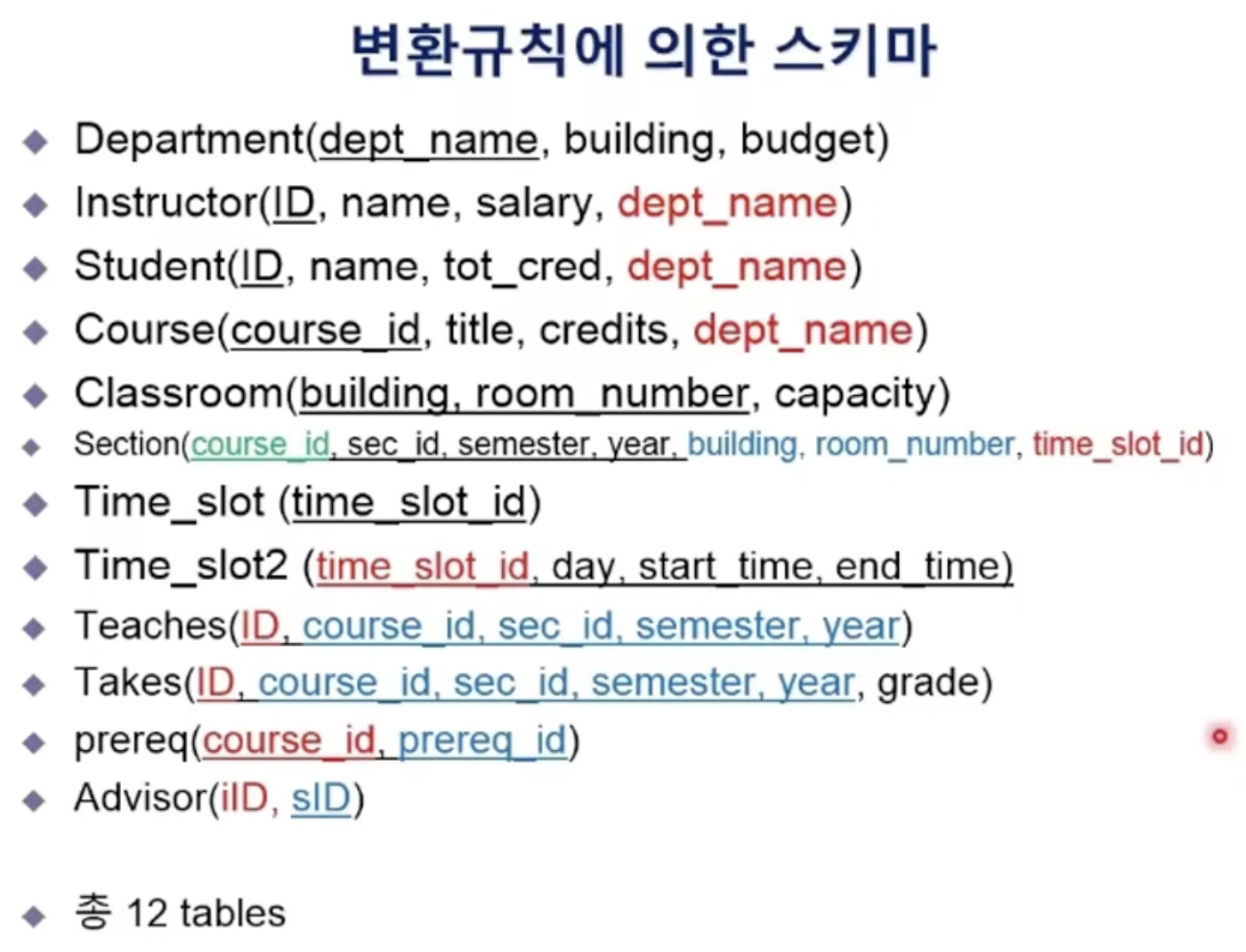 - 하나로 흡수했더니 section의 time_slot_id로 Time_slot에서 고유식별이 어렵게 되었다. 따라서 time_slot_id는 더이상 외래키가 아니다.