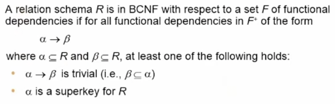 - 그 종속관계중에서 trivial 한것은 당연히 아래 첫번째 조건을 만족하고 non trivial 한 관계는 아래 제시된 조건을 만족해야 한다. 그럼 BCNF가 된다.