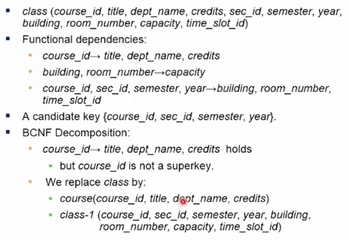 - 이 예시를 보면 dept_name -> building, budget 이라는 non trivial 함수 종속관계가 성립은 하지만 a부분인 dept_name은 슈퍼키가 아니다. 따라서 이 테이블은 BCNF의 조건에 위배된다.