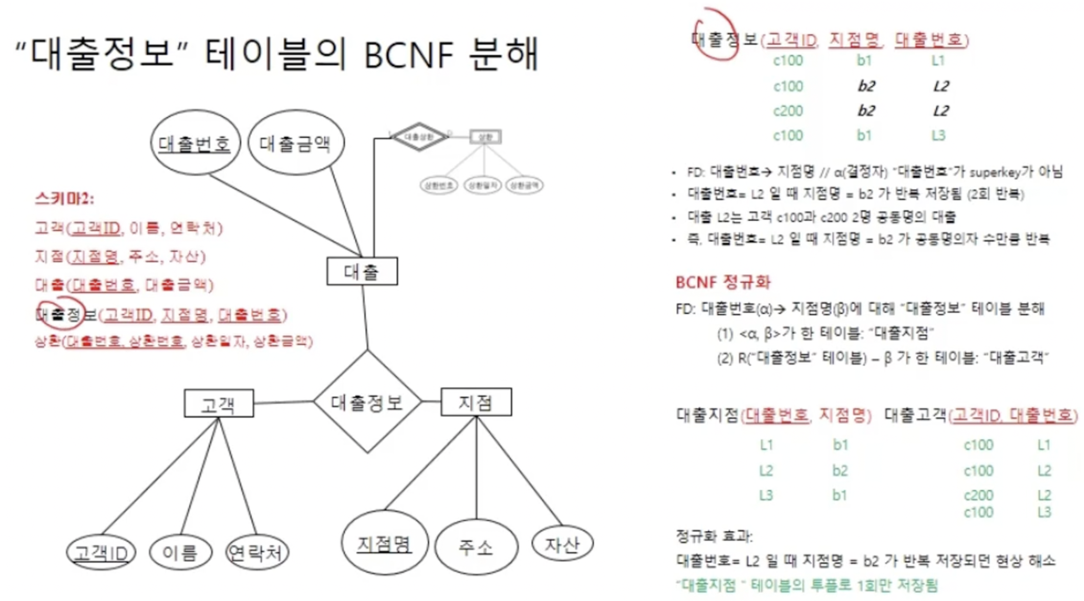 - 대출정보 테이블에서 대출번호는 특정 지점을 결정하는데 대출번호 단독은 superkey가 아니기 때문에 BCNF가 아니다.