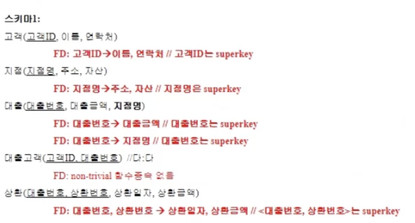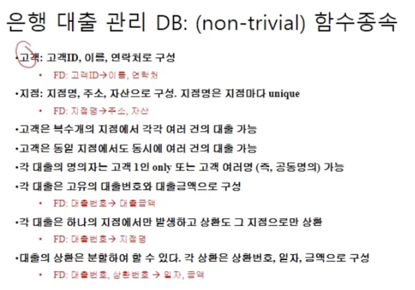 - 대출 고객 테이블을 보면 고객ID가 대출 번호를 결정하지 않는다 (같은 고객이 여러번 대출을 받을 수 있음) 이 테이블에서는 함수 종속관계가 없다. 여기에는 trivial FD만 존재한다.