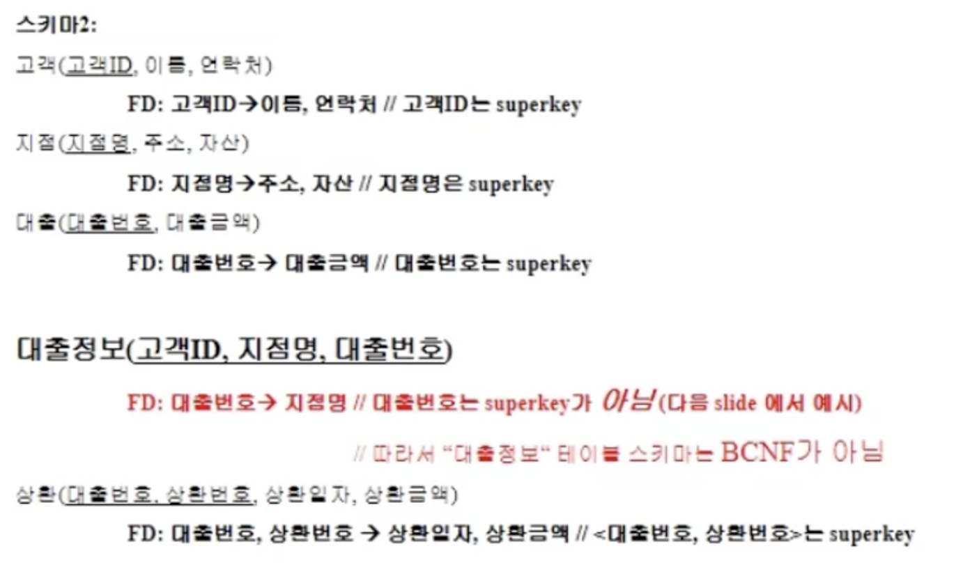 - 대출정보 테이블에서 대출번호는 특정 지점을 결정하는데 대출번호 단독은 superkey가 아니기 때문에 BCNF가 아니다.