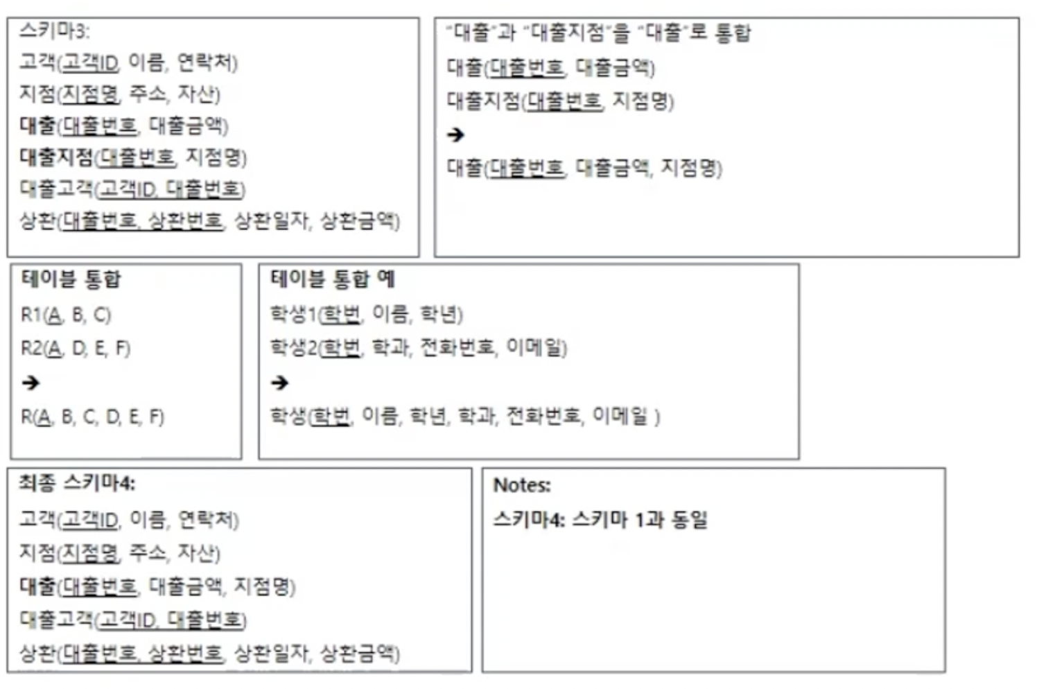 - 여기서는 대출 테이블과 대출지점 테이블의 통합이 이루어져 더 좋은 스키마가 도출되었다.