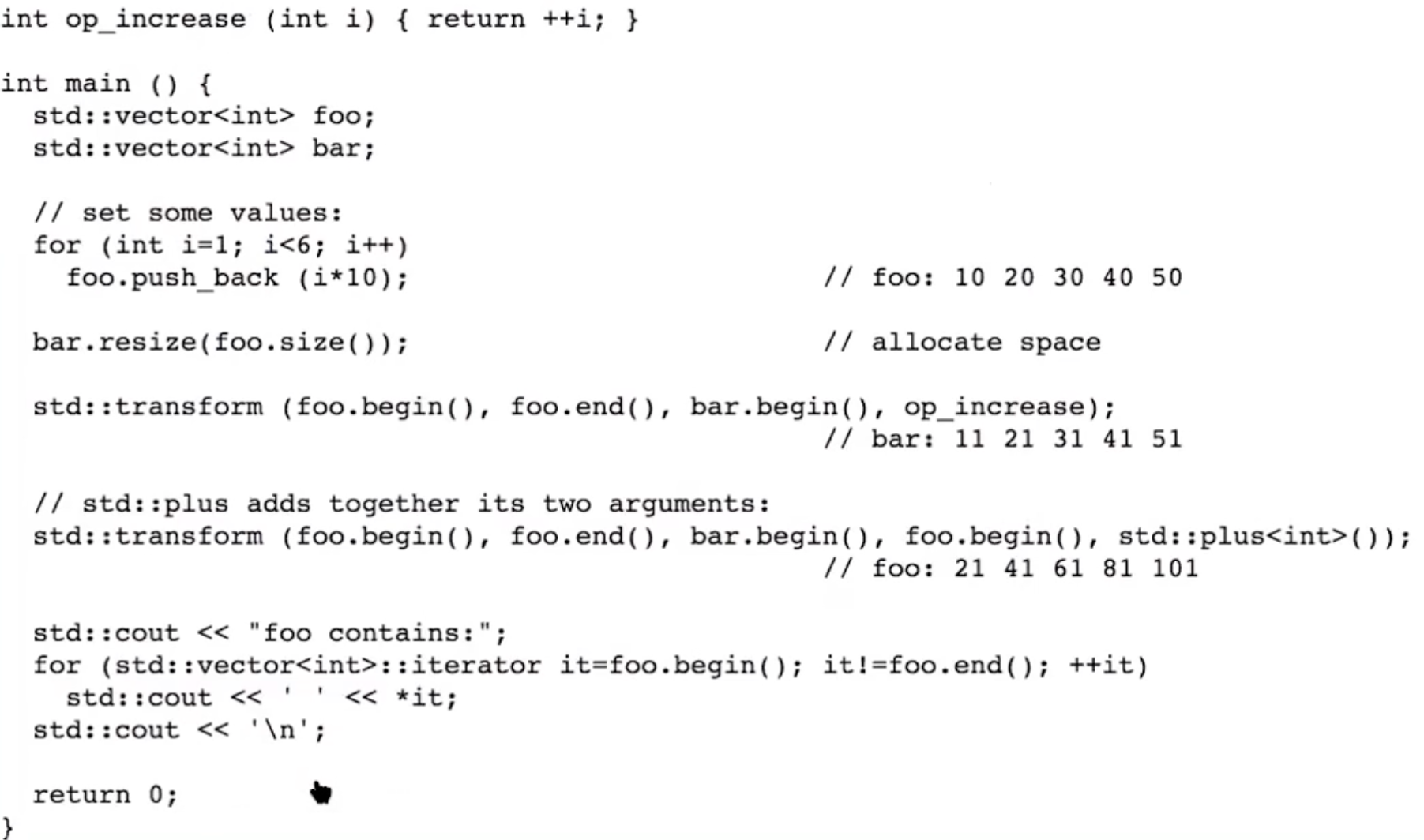 - foo에서 (임의의)시작, (임의의)끝 iterator를 넘겨주고 bar에서 원하는 위치에 시작 interator를 넘겨준다. 그리고 새롭게 정의한 함수를 넣어주면 foo에서 꺼낸 element들을 op_increase를 거치게하여 나온 결과들을 bar에 담는다.