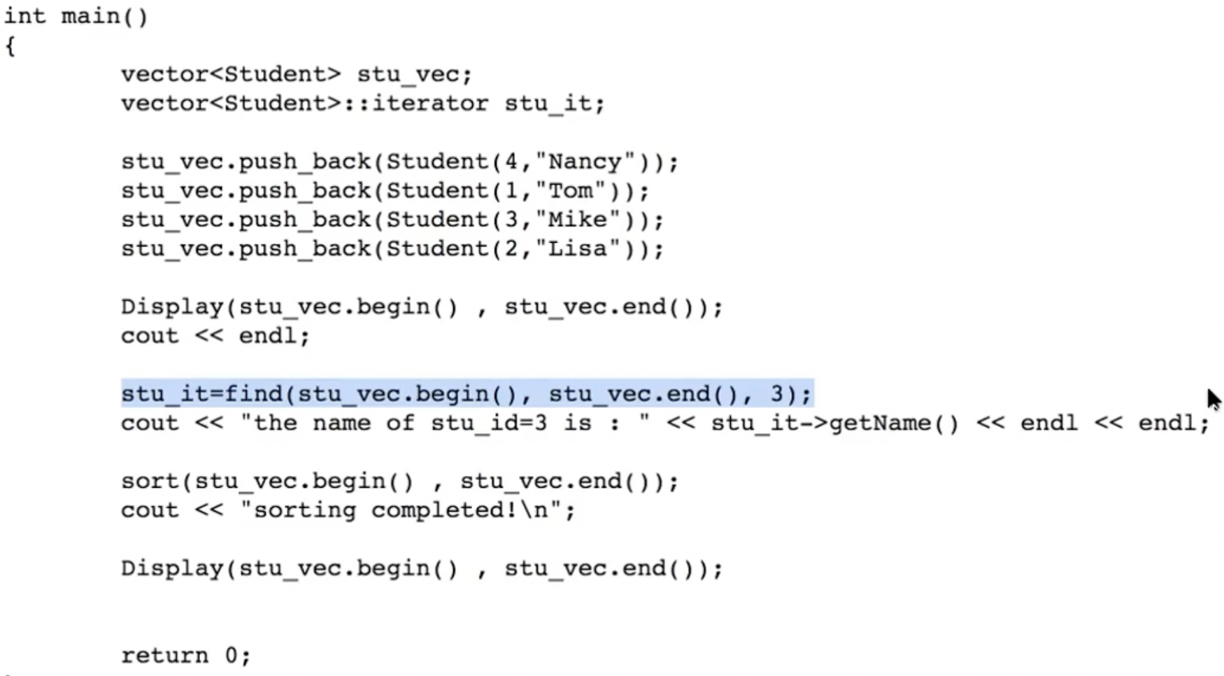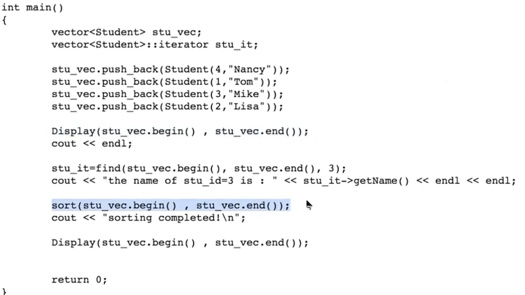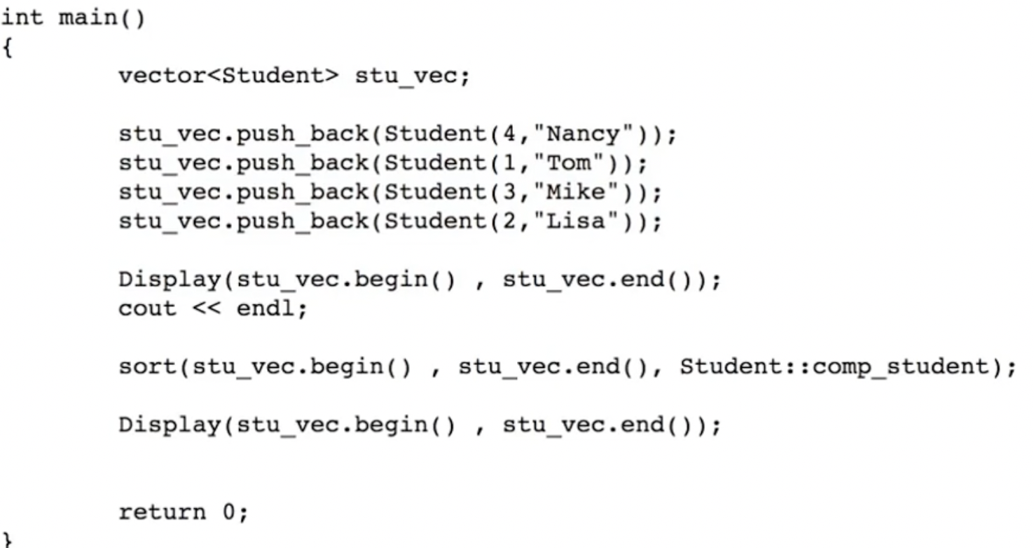 - vector에 사용자가 직접 정의한 Student class가 들어가 있다고 하자.