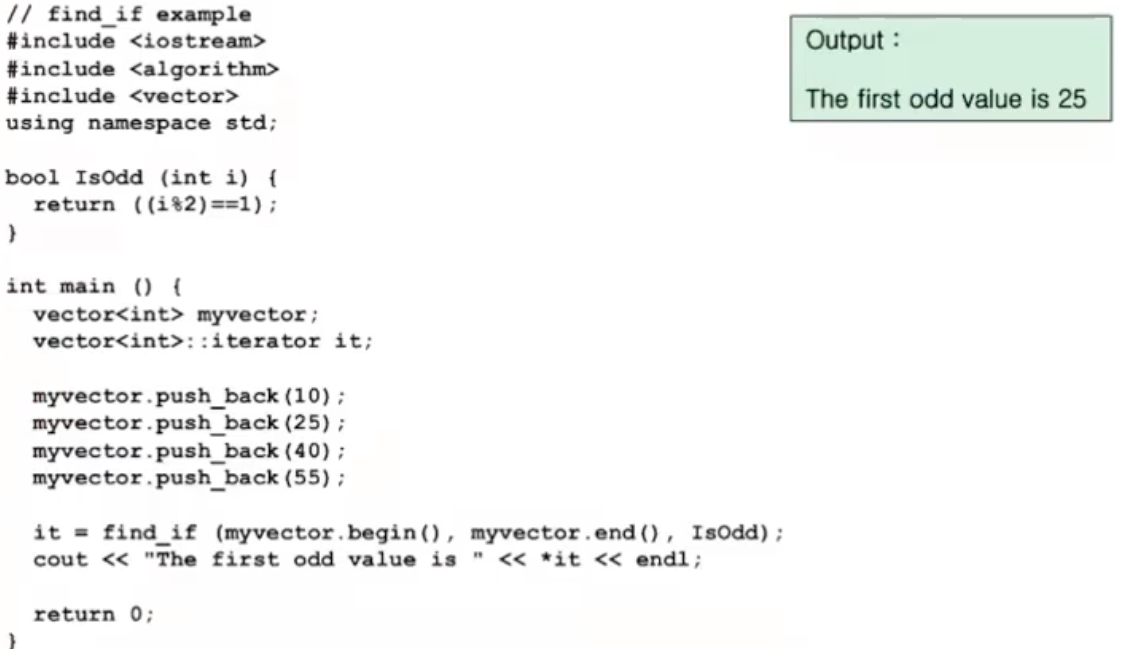 - find와 비슷한데 value를 넘겨서 같은 element를 찾는게 아니라 함수를 넘겨서 true를 반환하는 element를 찾는다.