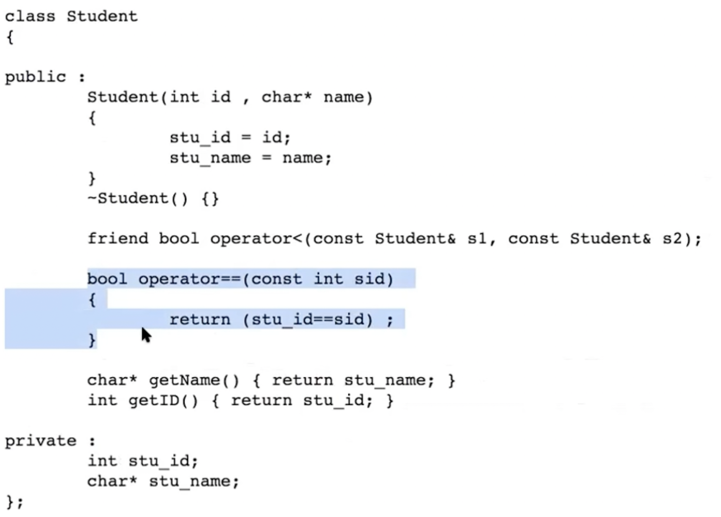 - Student(3, "Mike")와 3을 비교할 수 있도록 하는 ==연산자를 오버로딩 해주면 될 것이다.