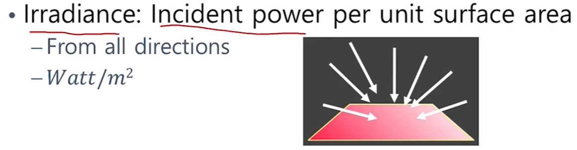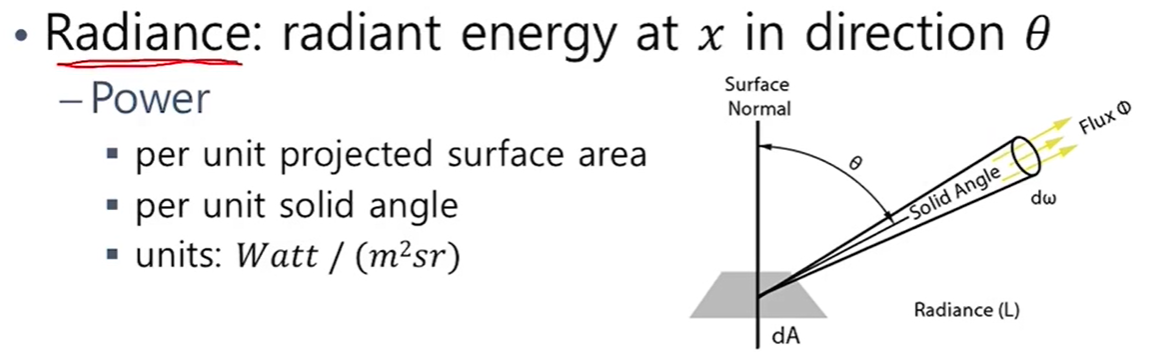 - 빛의 power란 unit surface area에서 unit solid angle로 얼마만큼 빛의 에너지가 나가는가를 말한다.