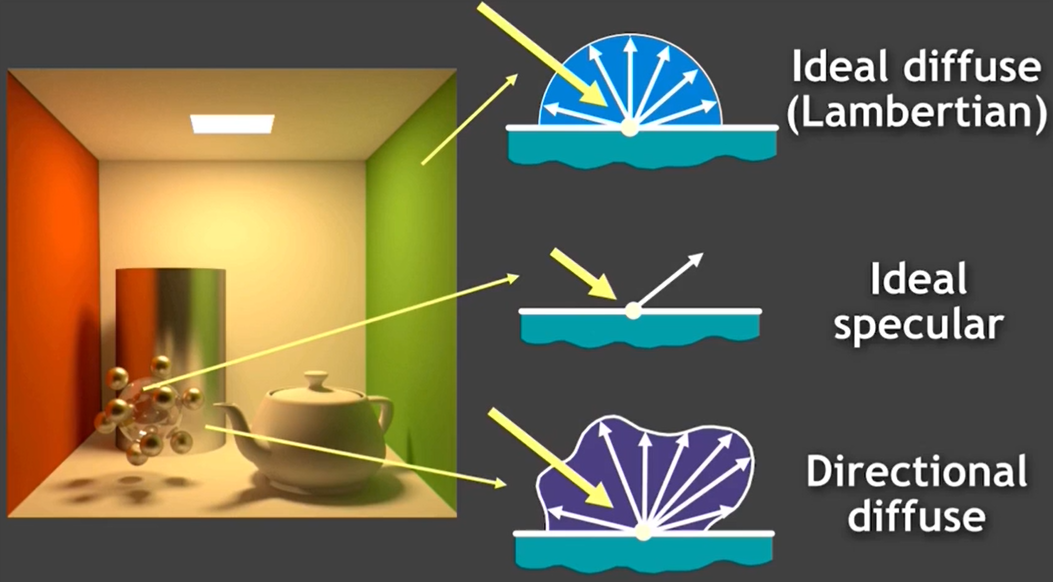 - directional diffuse는 특정 방향으로 반사될 확률을 높지만 다른 방향으로도 반사될 확률이 유의미하게 많이 존재한다고 한다.