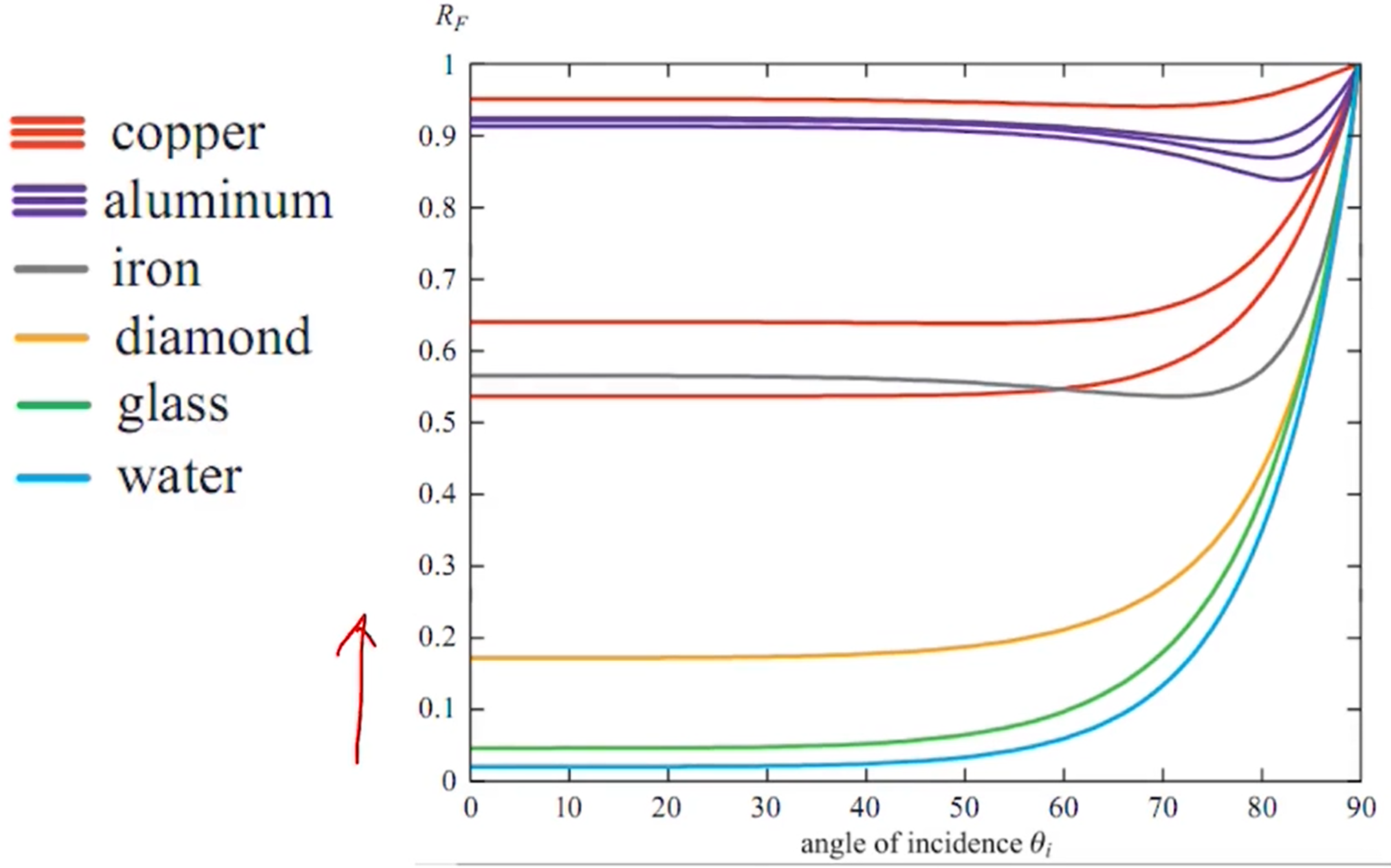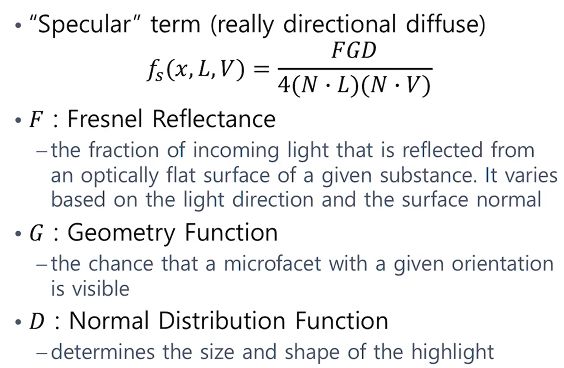 - F는 입사각과 같은 각으로 반사 되는 비율을 나타낸다(정반사). 입사각과 surface에 normal에 좌우된다.
