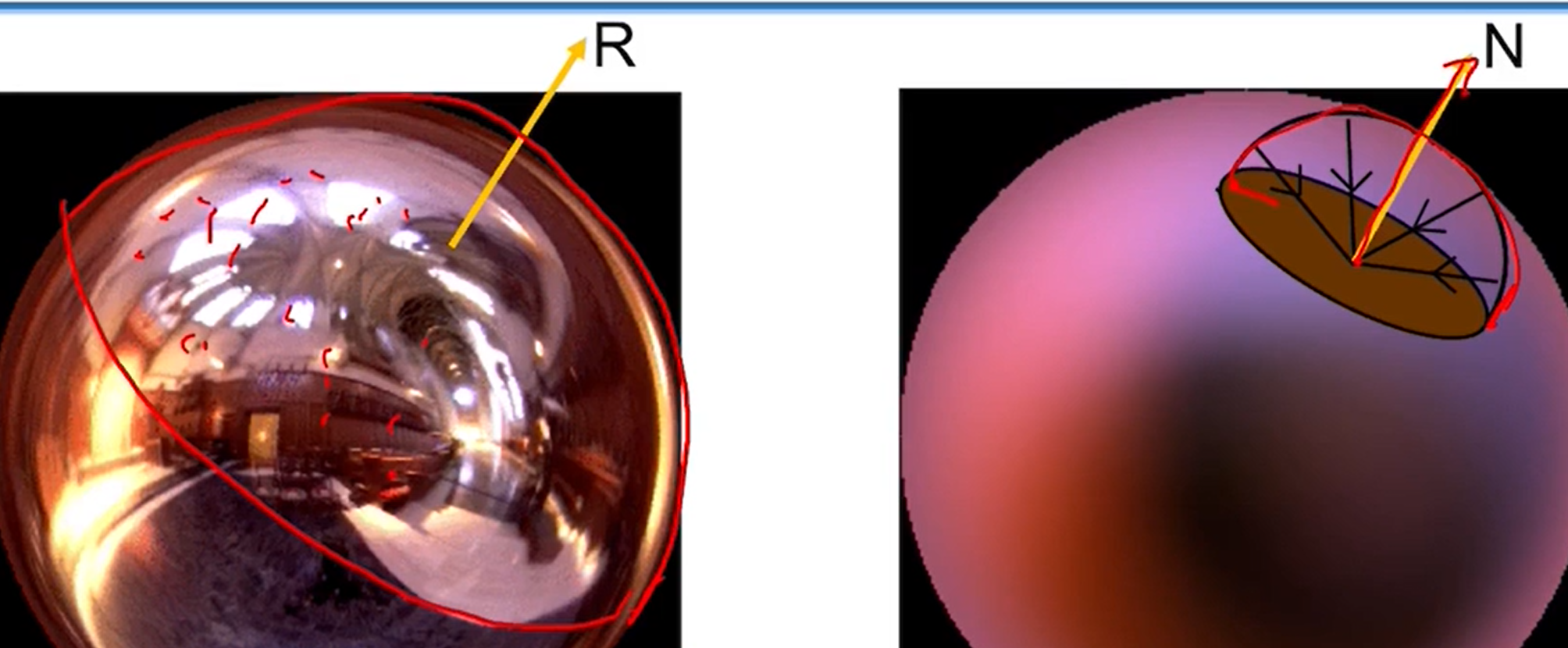 - 우측 사진의 지점에서 반사되는 빛을 계산한다고 하면 environment map의 반구 부분을 가지고 구한다.