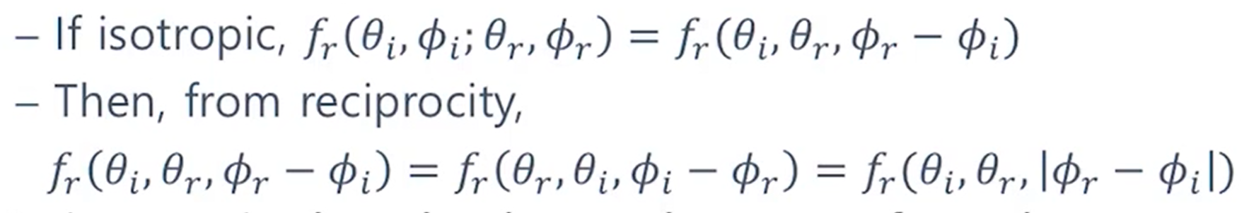 - brdf의 특징중 하나는 reciprocity(상호성)가 있다는 것이다. wi와 wr을 바꿔도 동일한 결과가 나온다.