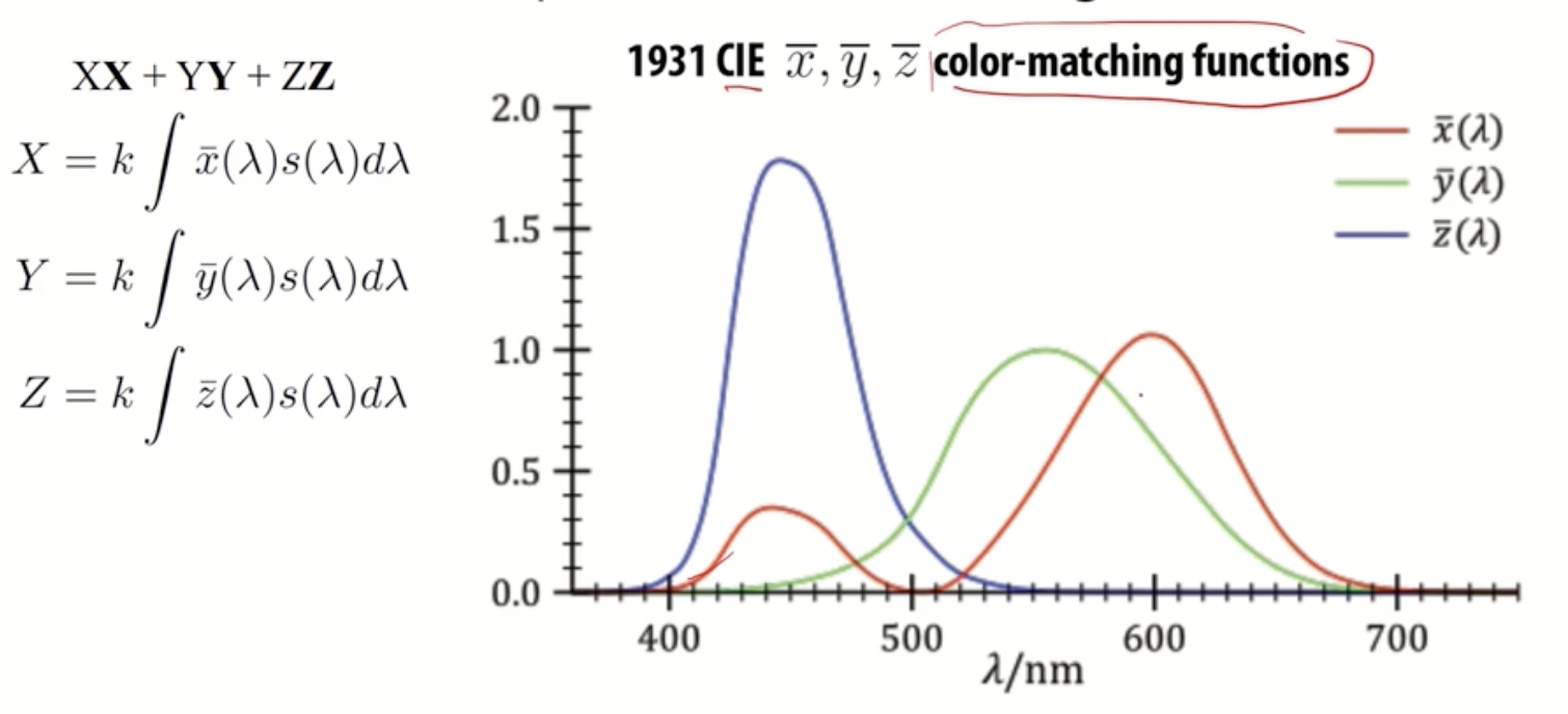 - CIE가 세개의 color matching function은 정의했다. 전부 positive light만 있다고 가정한다.