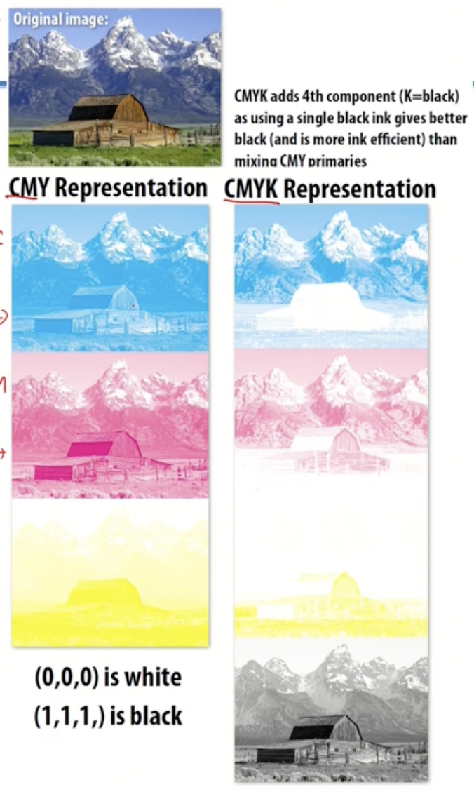 - rgb대신 c(1-r), m(1-g), y(1-b)를 대신 사용한다. 색을 합칠수록 어두워진다.
