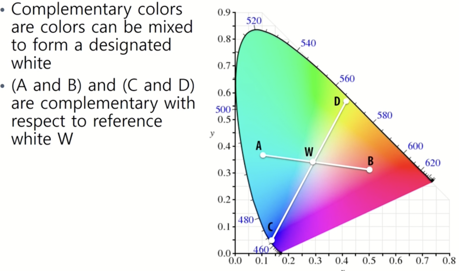 - 검은 Line으로부터 안쪽으로 이동할 수록 여러 파장의 빛의 combination 색을 나타낸다.