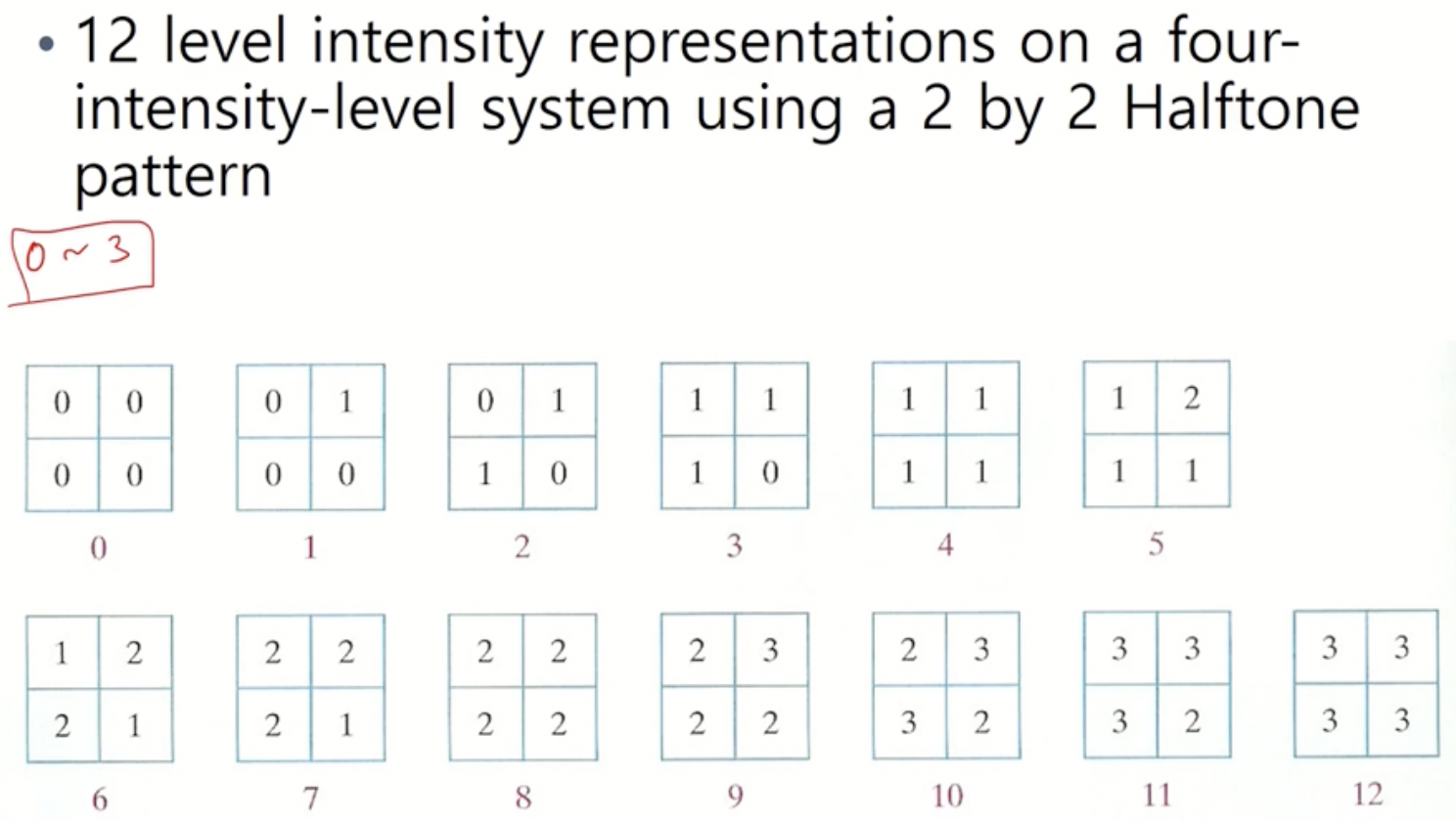 - 네개의 픽셀을 가지고 halftoning을 구현한다고 하면 0부터 4까지 intensity를 표현할 수 있다.