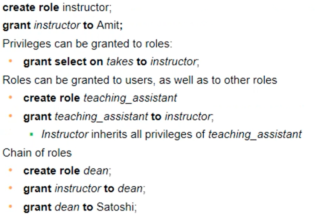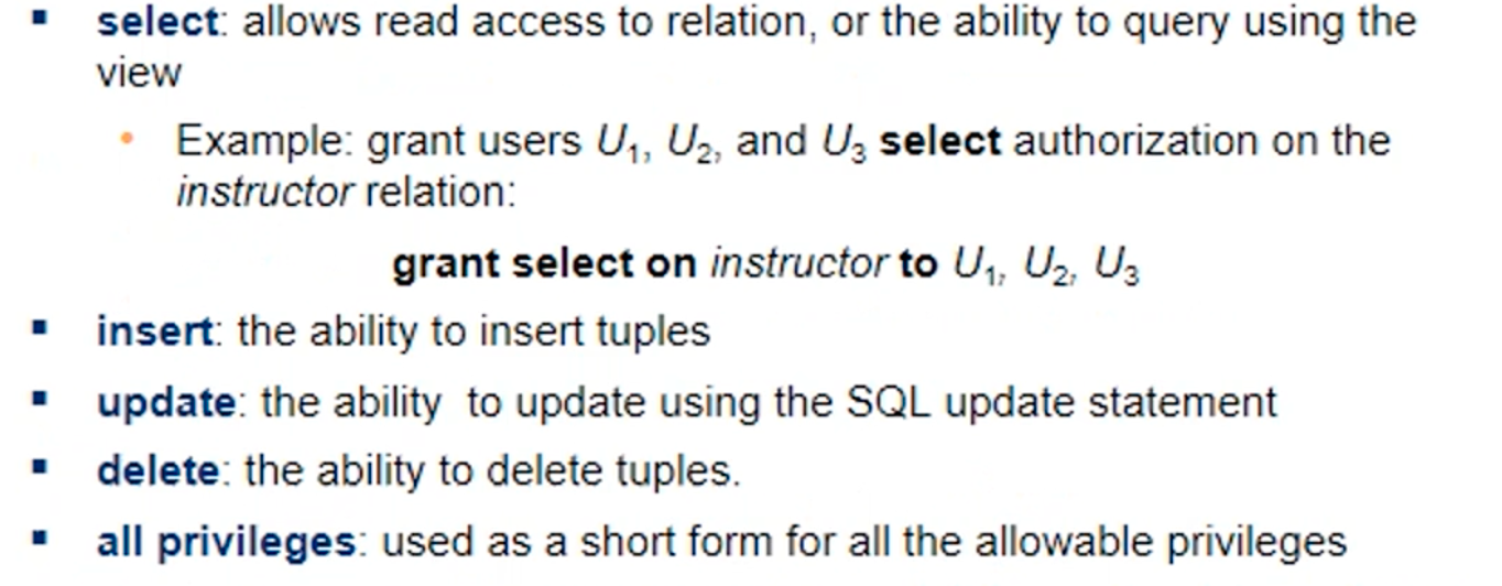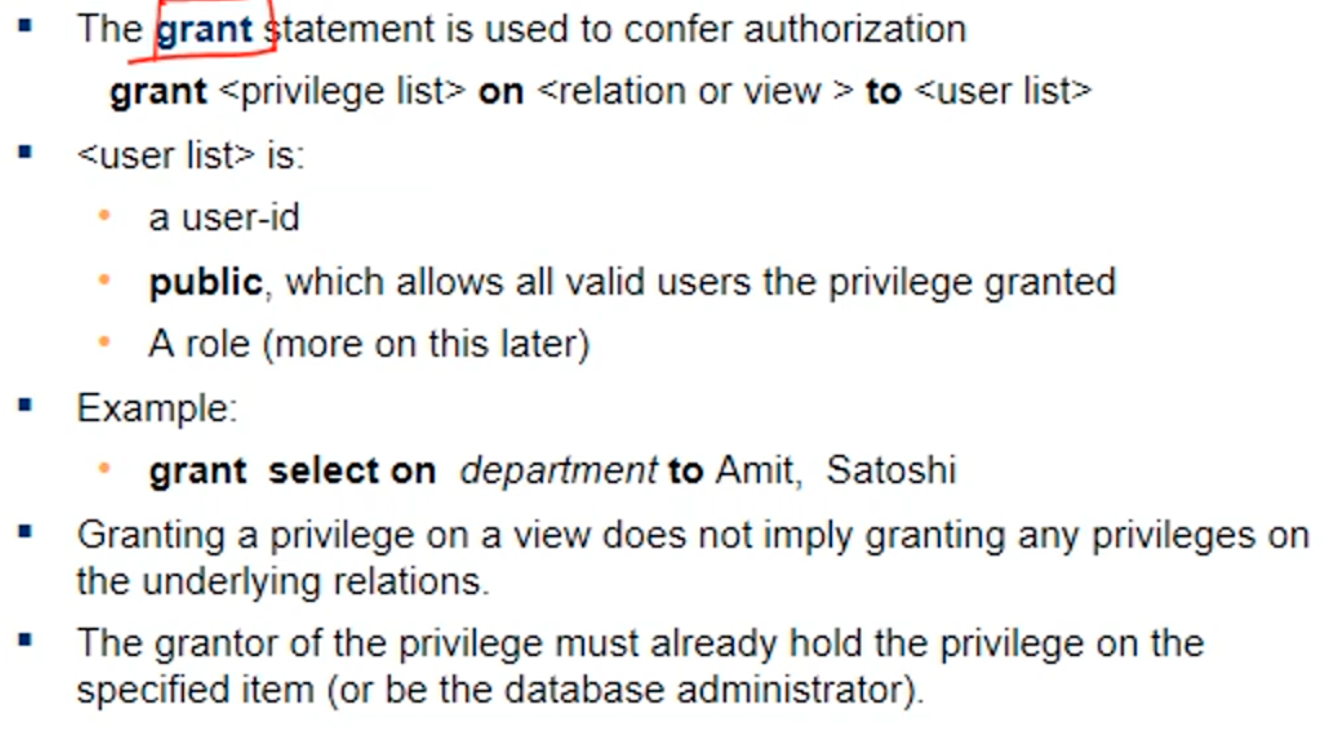 - 특정 사용자가 어떤 relation이나 view에 대해 권한을 부여하는 구문이다.