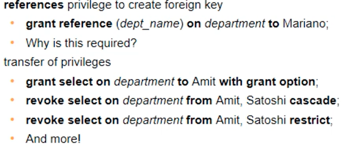 - 첫번째 예시 : Amit에게 department를 조회할 수 있는 권한을 준다. with grant option은 amit이 이 권한을 다른 사용자에게 줄 수 있다는 옵션을 말한다.