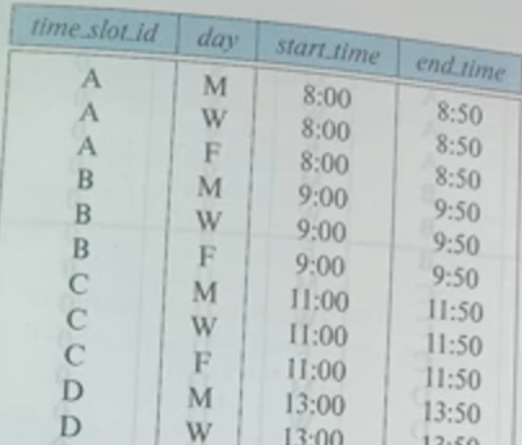 - section 테이블의 time_slot_id 는 time_slot 테이블의 time_slot_id중에서만 값이 올 수 있다는 제약 구문이다.