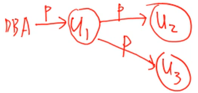 - DBA가 U1에게 p권한을 부여했다. 근데 U1이 p를 U2, U3에게 부여한 상황이다. 만약 DBA가 U1으로부터 p의 권한을 뺏으면 U1이 나누어준 권한들도 회수해야 마땅하다.