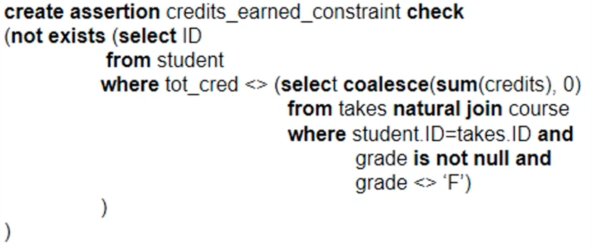 - 예를들면 student 테이블의 tot_cred은 takes에서 해당 학생이 수강한 과목들의 학점 합과 같아야한다. 이 상태를 assertion으로 항상 유지하도록 할수 있다.