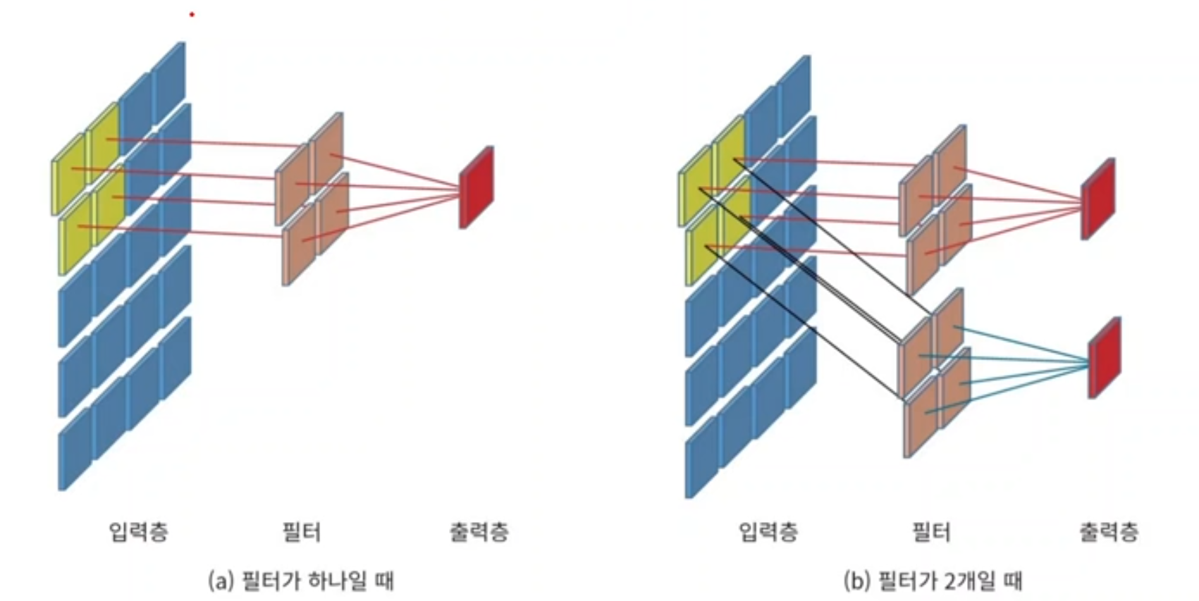 - 그리고 필터의 값은 미리 정해진게 아니라 출력층의 개수를 설정하면 학습을 통해 정해진다.