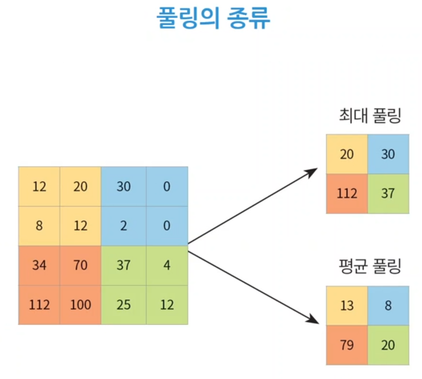 - 최대풀링은 영상처리 의미에서는 엣지, 선, 코너 등의 특징을 살려주는 측면이 있고 평균풀링은 노이즈 제거 효과가 있다.