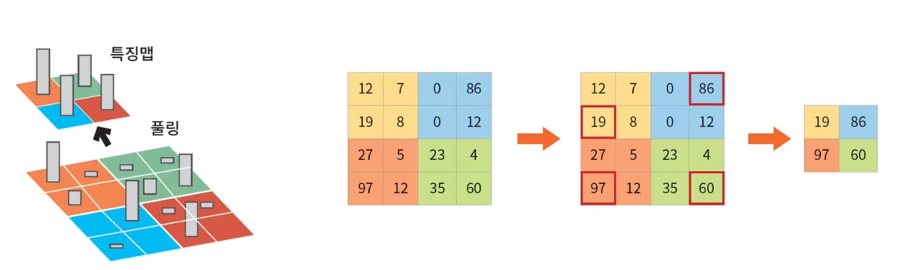 - 특징맵에 대해서 pooling을 수행한다. n by n 에서 최대값을 뽑으면 max pooling, 평균값을 꺼내면 mean pooling이라고 한다.
