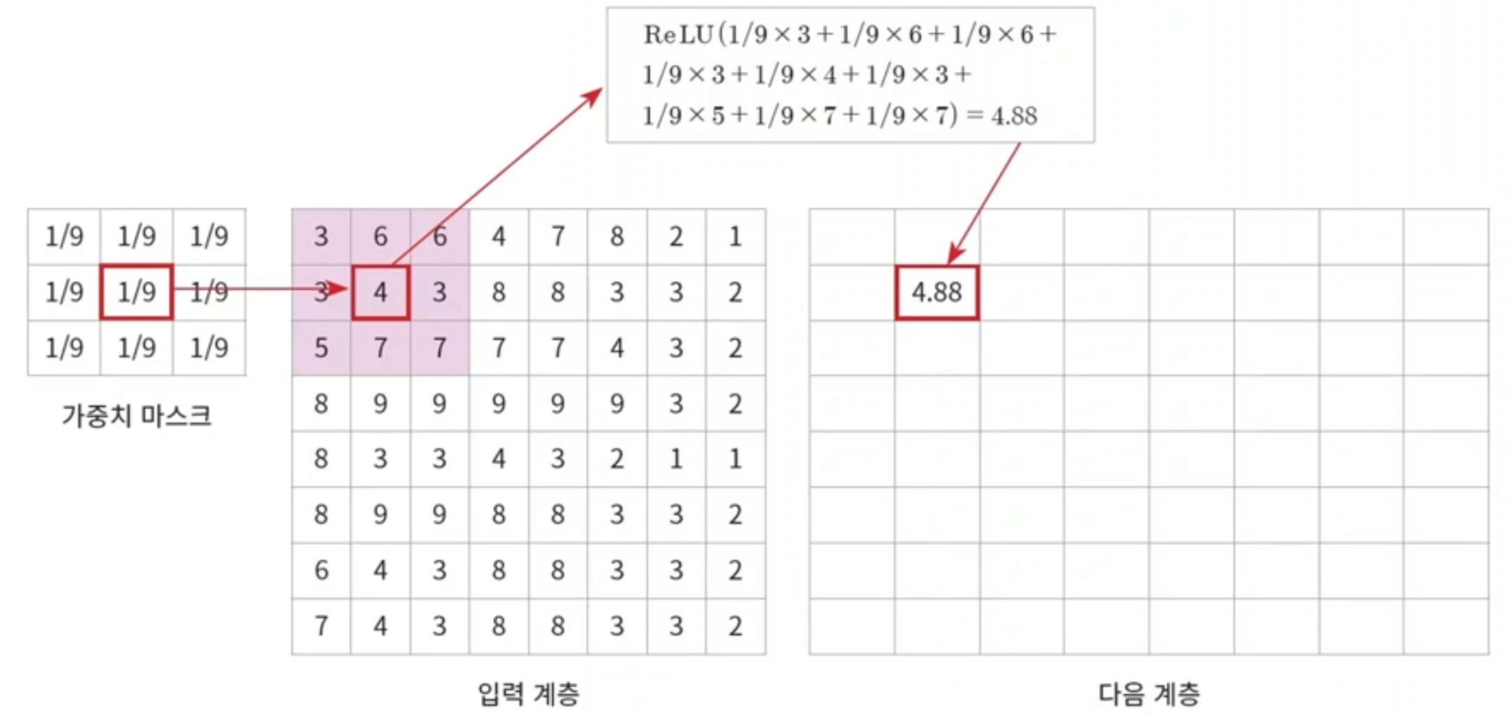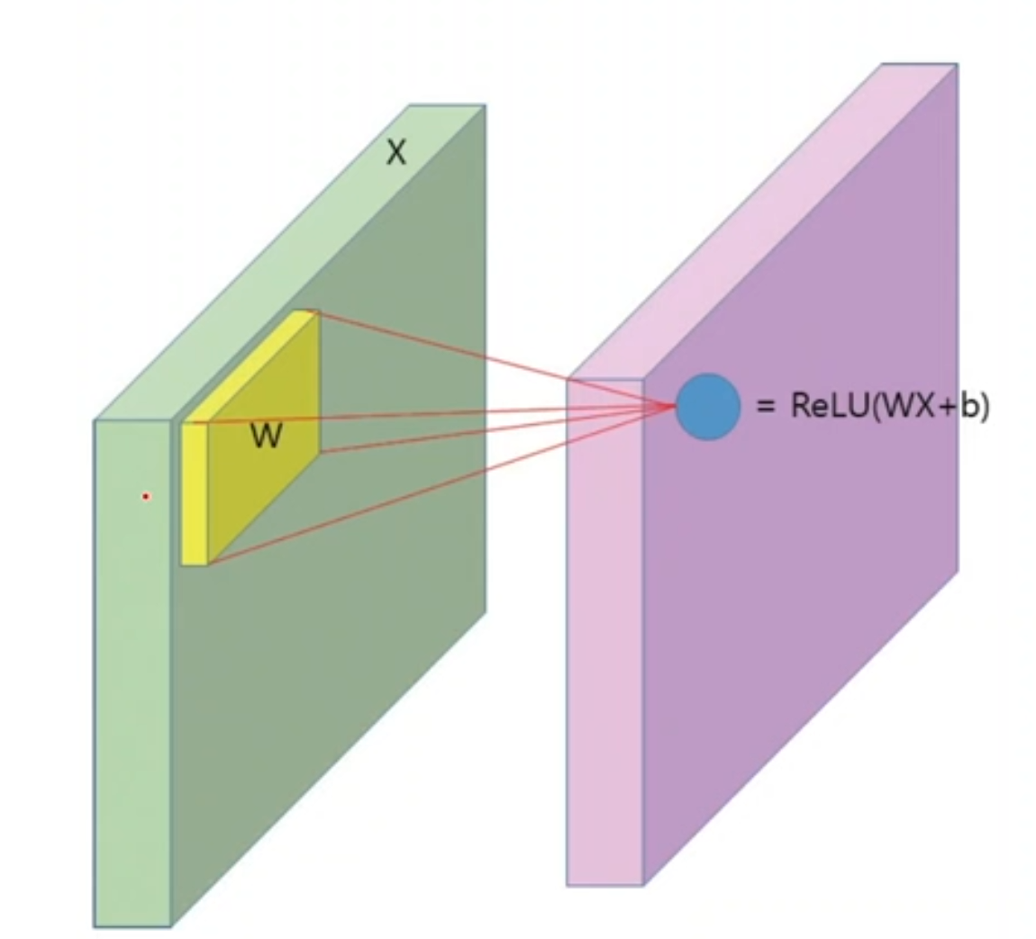 - convolution 연산은 주변 화소값들에 가중치를 곱해서 더한후 activation function을 통해 새로운 화소값을 계산한다.