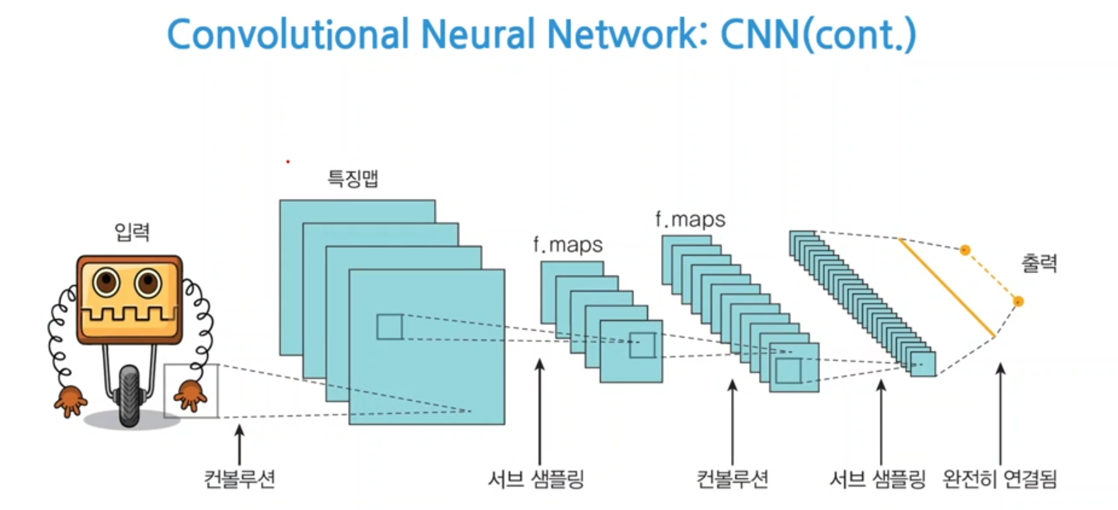 - 사진으로부터 컨볼루션 연산이 이루어지면 특징들을 추출한다. 계속 이 과정을 반복한다. fully connected layer가 되어 최종 분류할 class들과 연결이 된다.