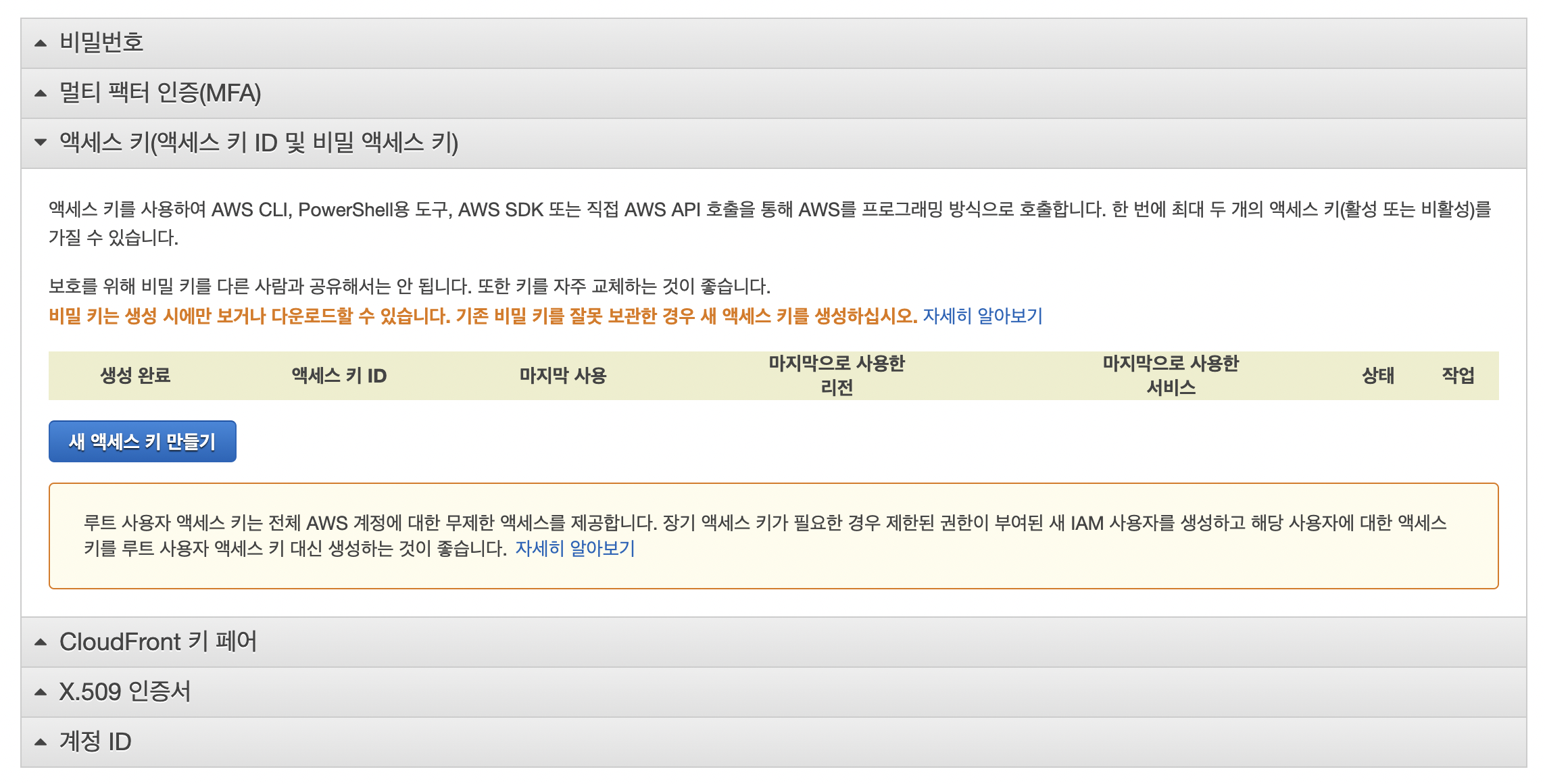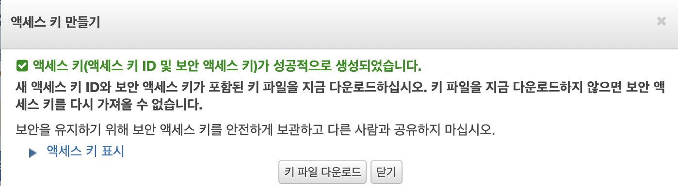 - 엑세스 키는 다시 볼 수 없기 때문에 키파일 다운로드 버튼으로 저장해 둔다.