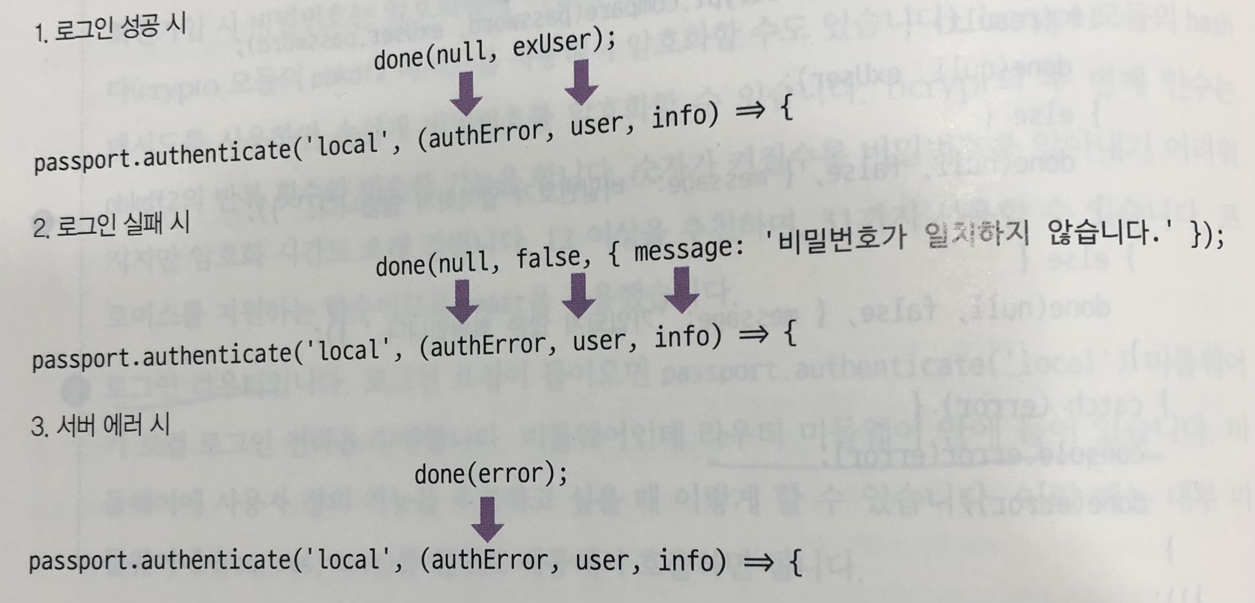 - 이렇게 전략이 done()을 호출하면서 수행이 완료되면 passport.authenticate의 콜백 함수에서 나머지 로직이 수행된다.