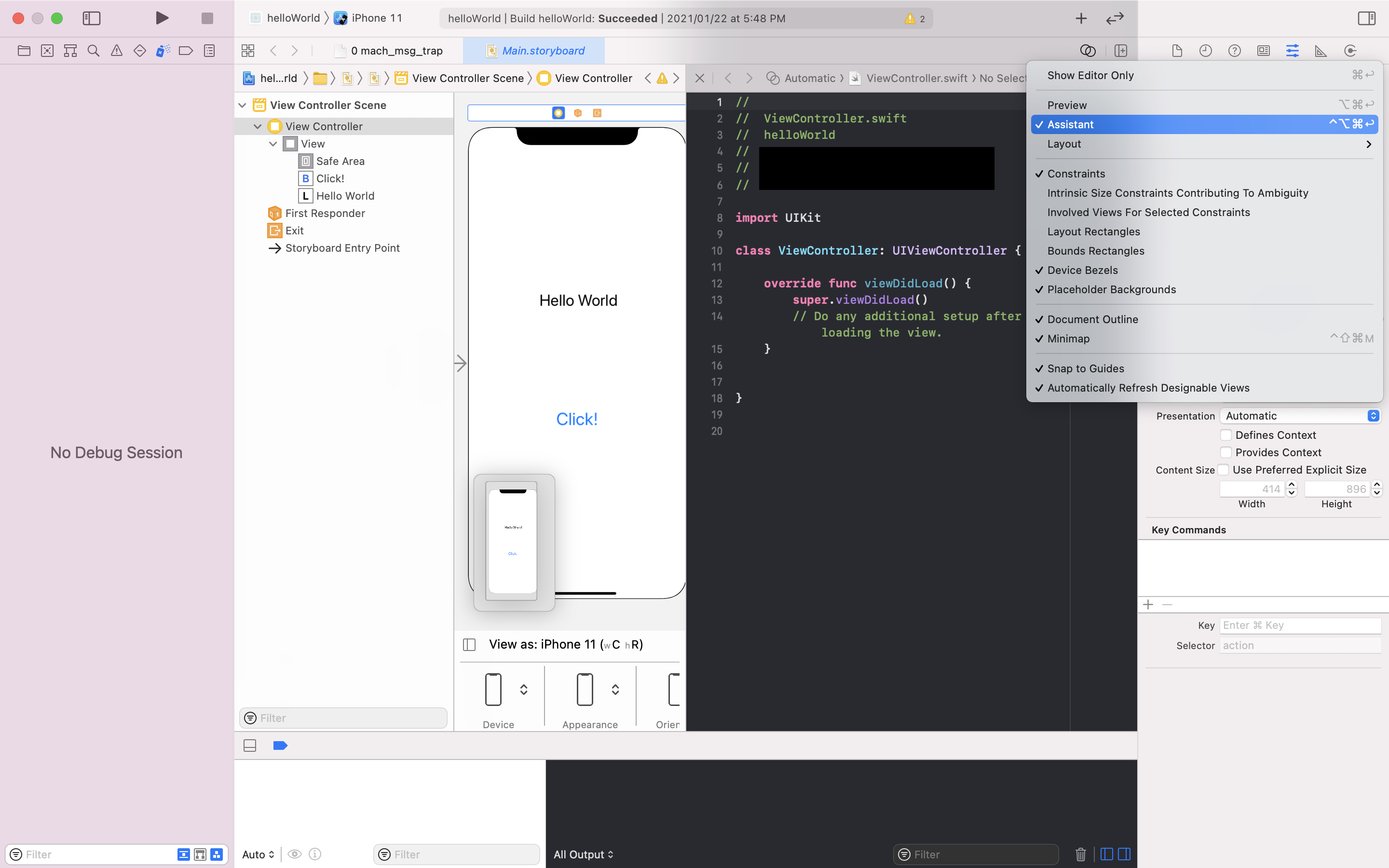 - Assistant를 클릭하면 View controller 뒤 실행되고 있는 코드가 보인다