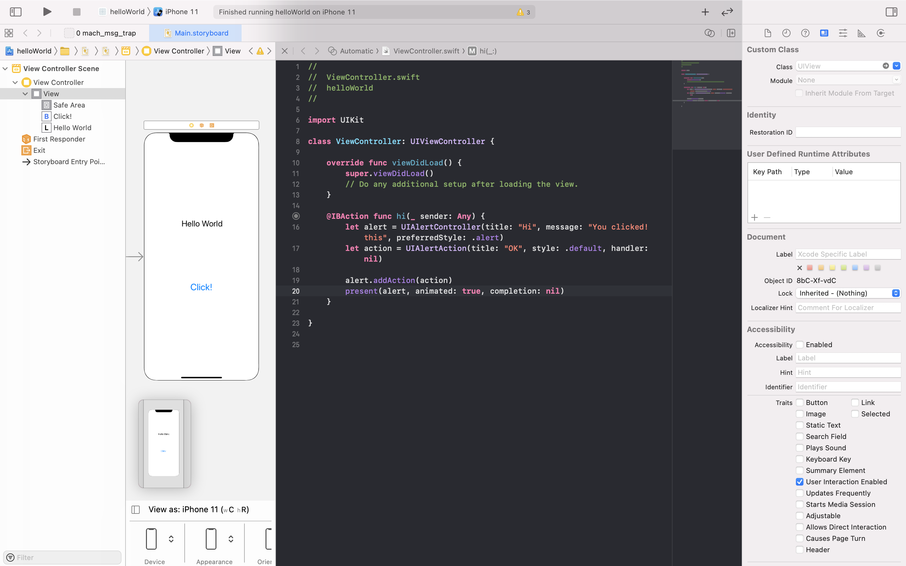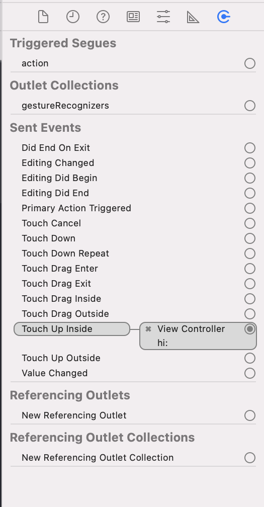 - Click! 버튼을 누르고 connections inspector를 보면 View Controller클래스 안에 hi라는 메서드와 연결되어 있다고 나온다.