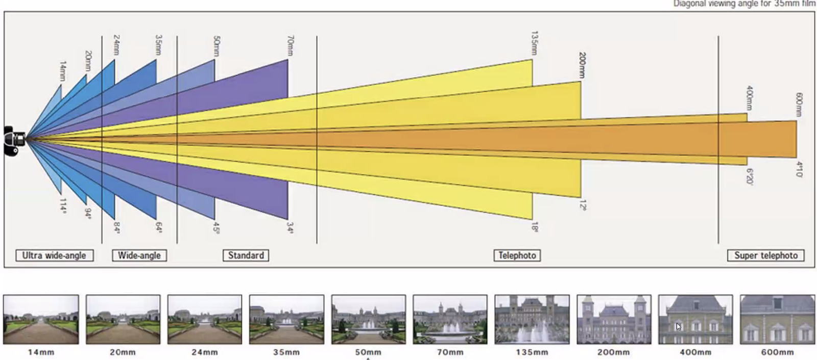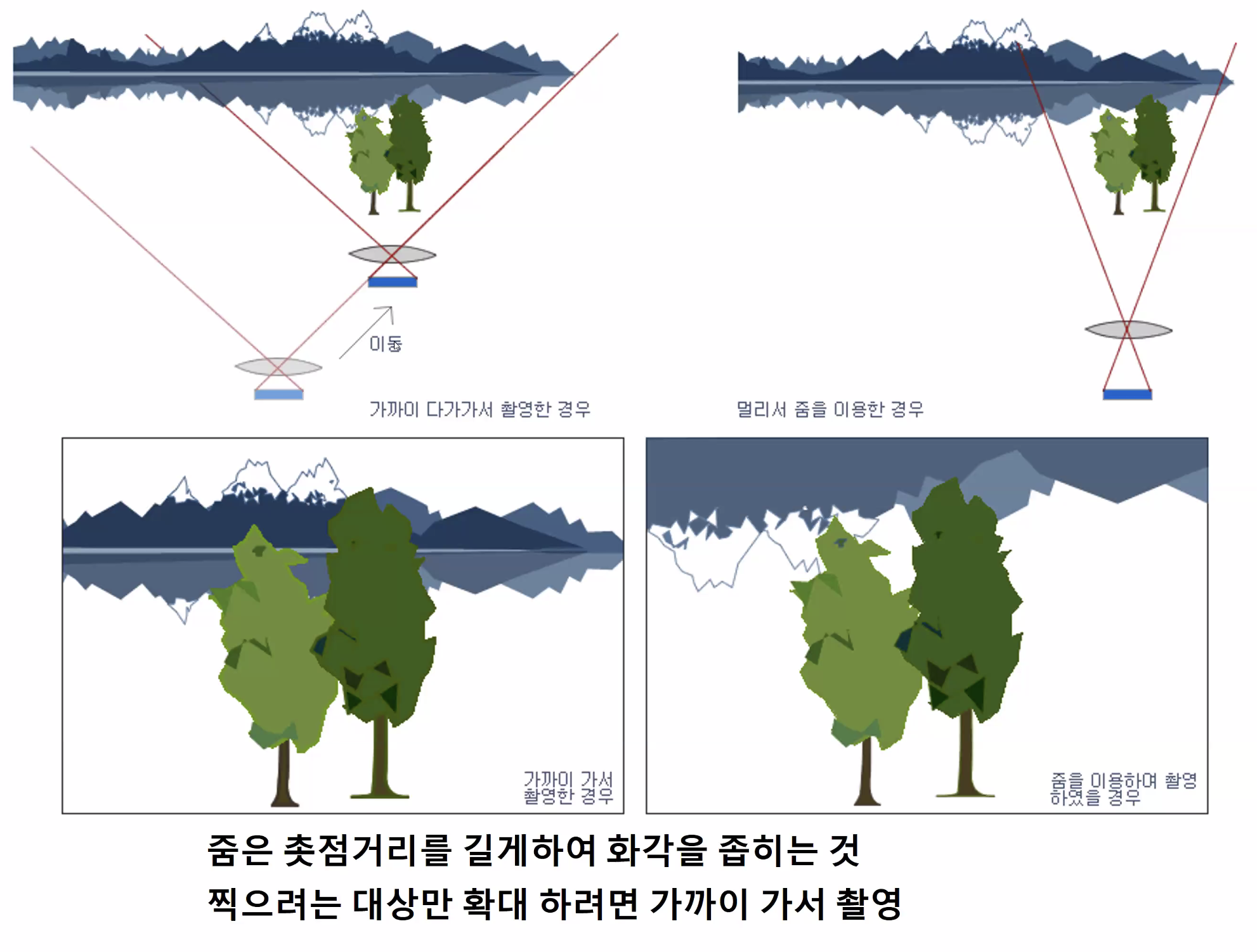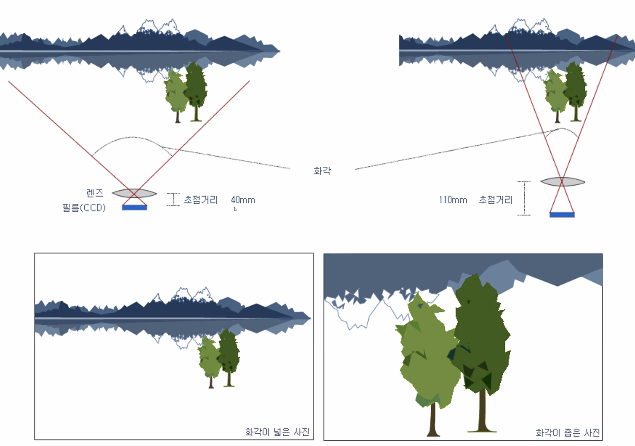 - 초점거리에 따라 화각이 달라진다. 초점거리가 짧을 수록 넓은 화각을 담을 수 있고 초점거리가 길수록 망원렌즈가 된다.