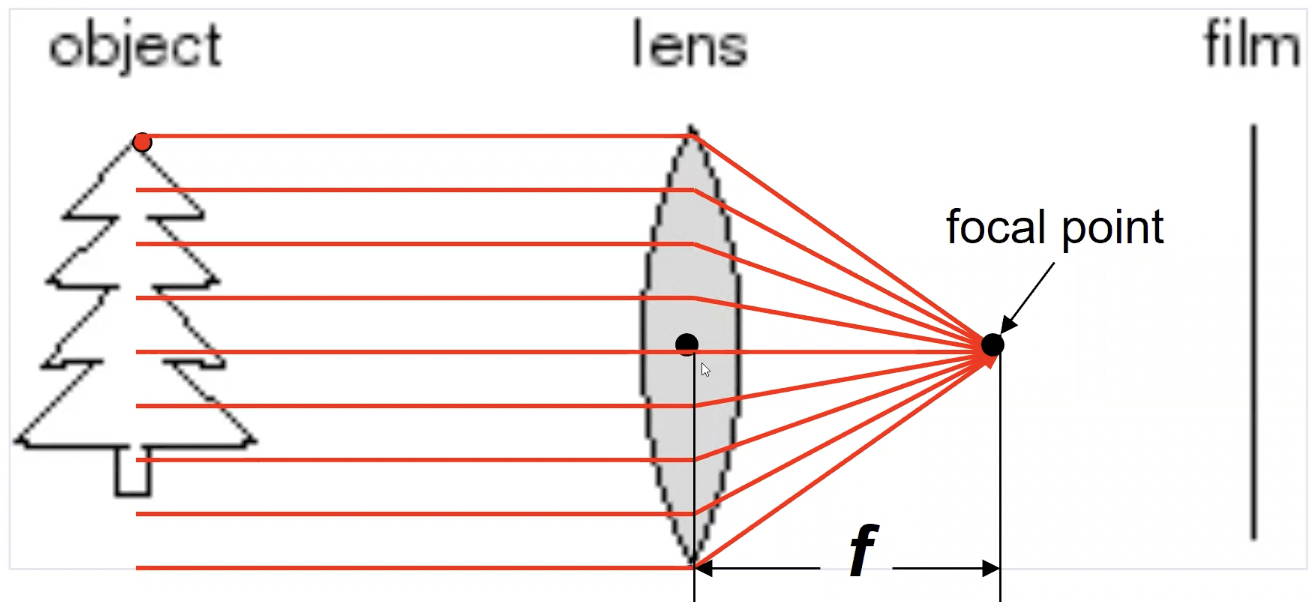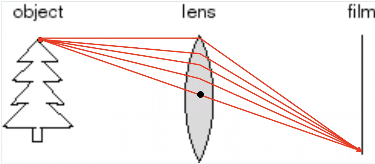 - 핀홀 카메라는 한 지점에서 반사된 모든 빛 중 핀홀을 통과하는 빛만 film에 맺히지만 이렇게 렌즈를 사용하면 반사되는 모든 빛을 한 점으로 모을 수 있다.