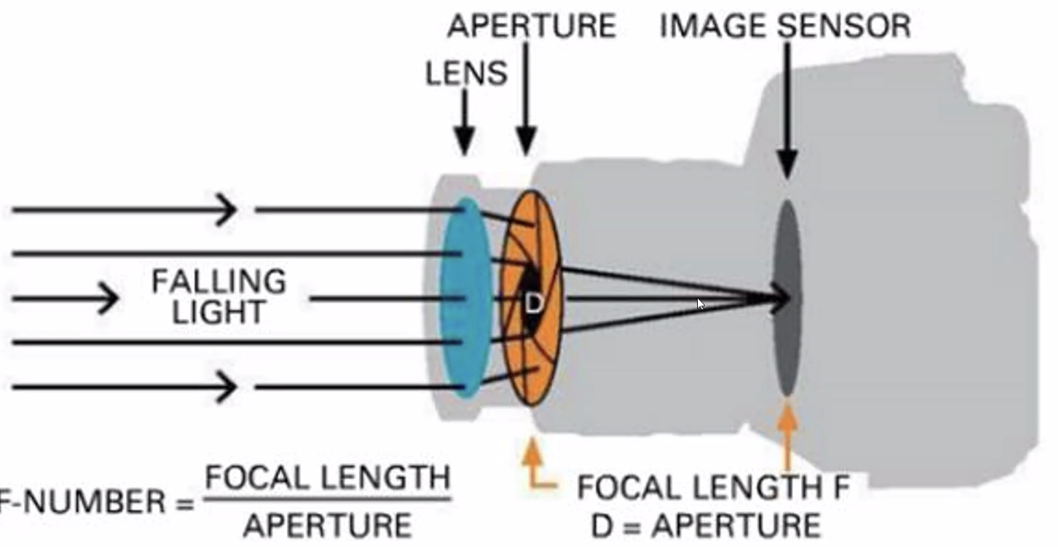 - 빛을 모아주는 lense, 빛의 에너지를 조절하는 aperture를 통과한 빛이 image sensor에 맺혀 3차원 물체를 2D 화면에 담는다.