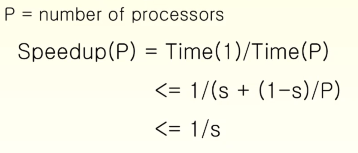 parallel에 의해 속도향상이 일어나더라도 1-s 파트에서만 해당한다. (Potential program speedup is defined by the fraction of code that can be parallelized) 따라서 speedup은 1/s보다 클 수 없다.