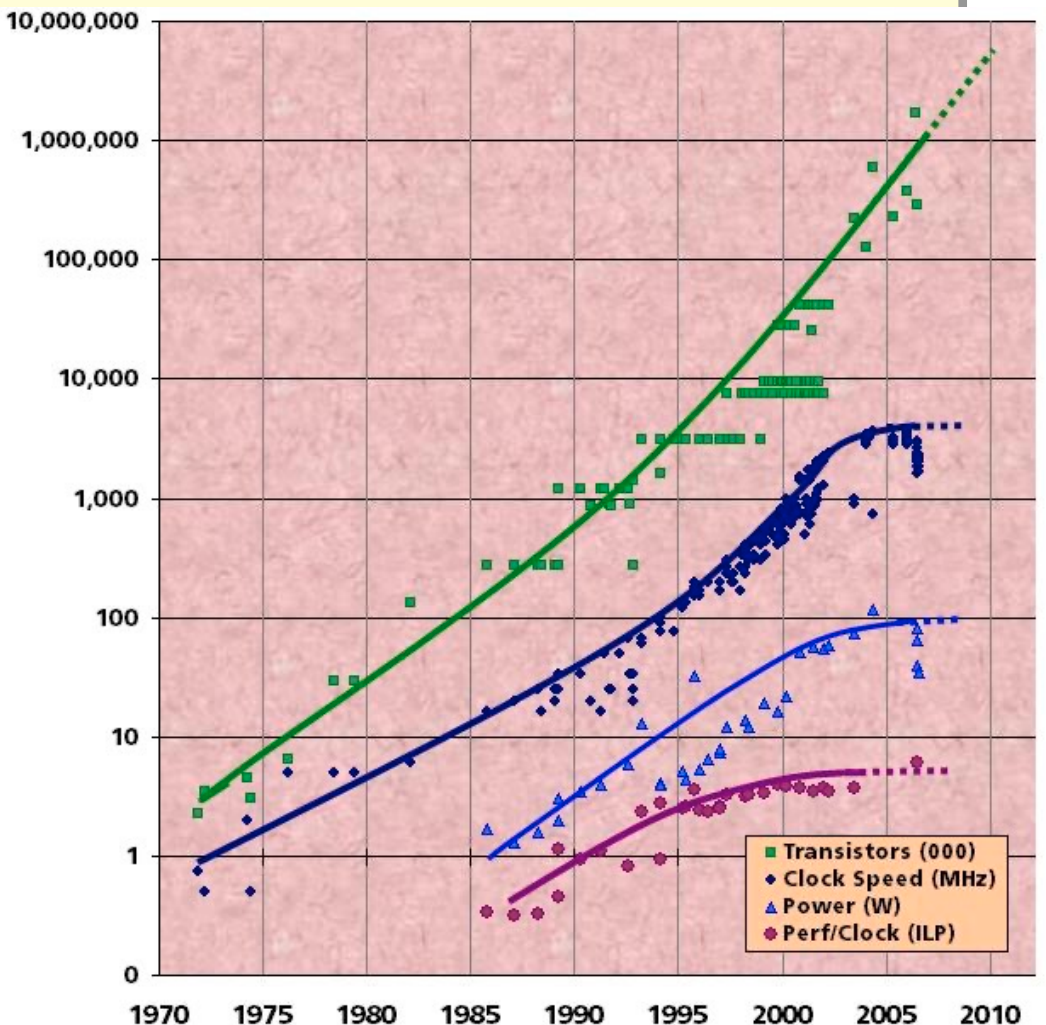 집적도가 커지고 clock speed가 빨라질수록 전력소비, 발열이 높아져서 clock speed 향상이 더뎌졌다.