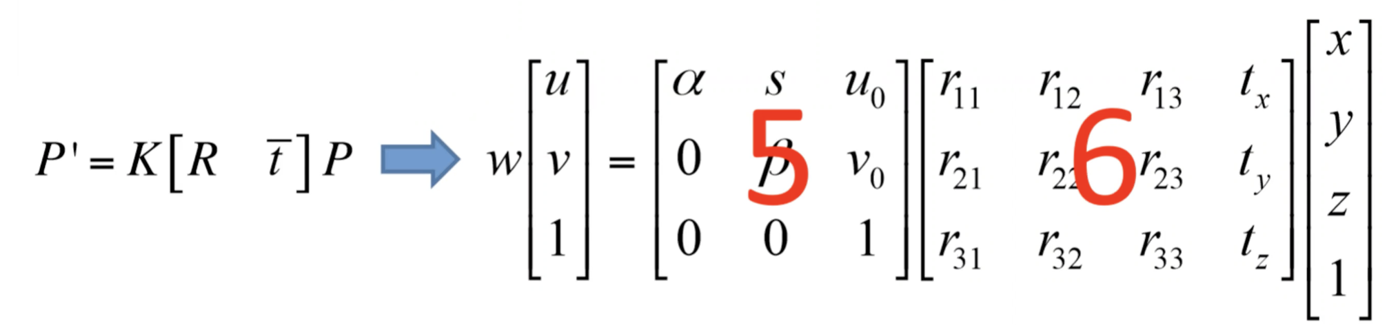 - 복습) 실제 3차원 좌표는 11개의 파라미터 값에 의해 2차원 화면에 대응된다. 예를들면 드론이 11개의 파라미터 값을 알기 때문에 2차원 영상을 가지고 3차원 실제 위치를 파악할 수 있다.