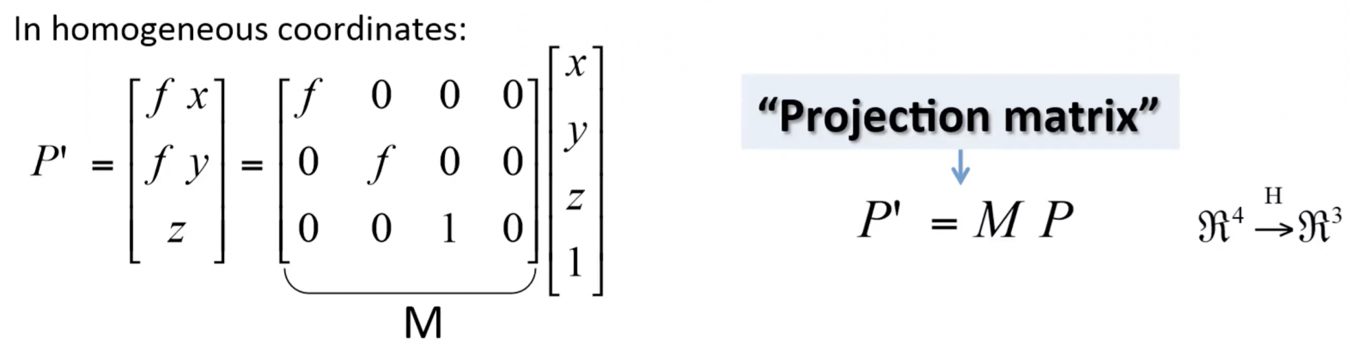 - 즉 위의 예시에서는 실세계의 삼차원 좌표 (x,y,z)를 (fx/z, fy/z) 점으로 사영시켰다.