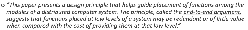 즉 네트워크 작동에 핵심이 아니면서 특정 사용자들에게 중요한 기능이라면 그 기능은 네트워크의 중심이아니라 종단에 위치해야 한다는 원칙이다.