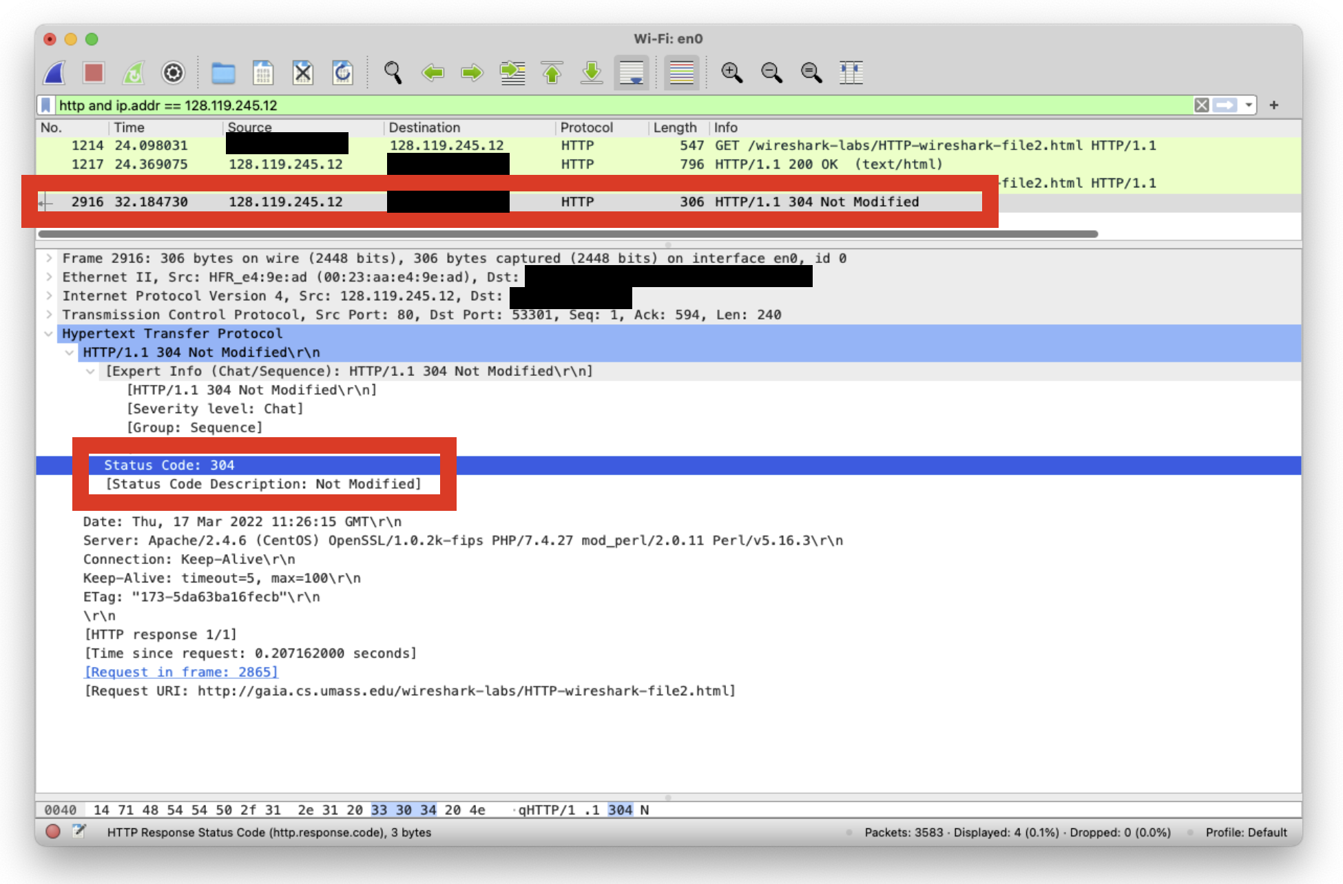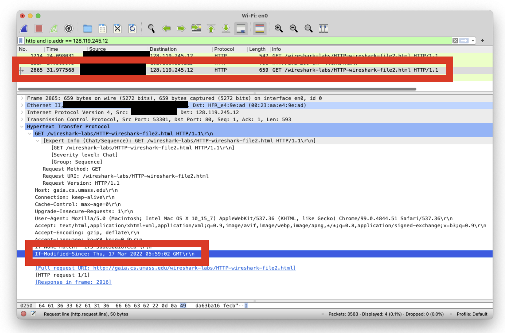 3. Now inspect the contents of the second HTTP GET request from your browser to the server. Do you see an “IF-MODIFIED-SINCE:” line in the HTTP GET? If so, what information follows the “IF-MODIFIED-SINCE:”