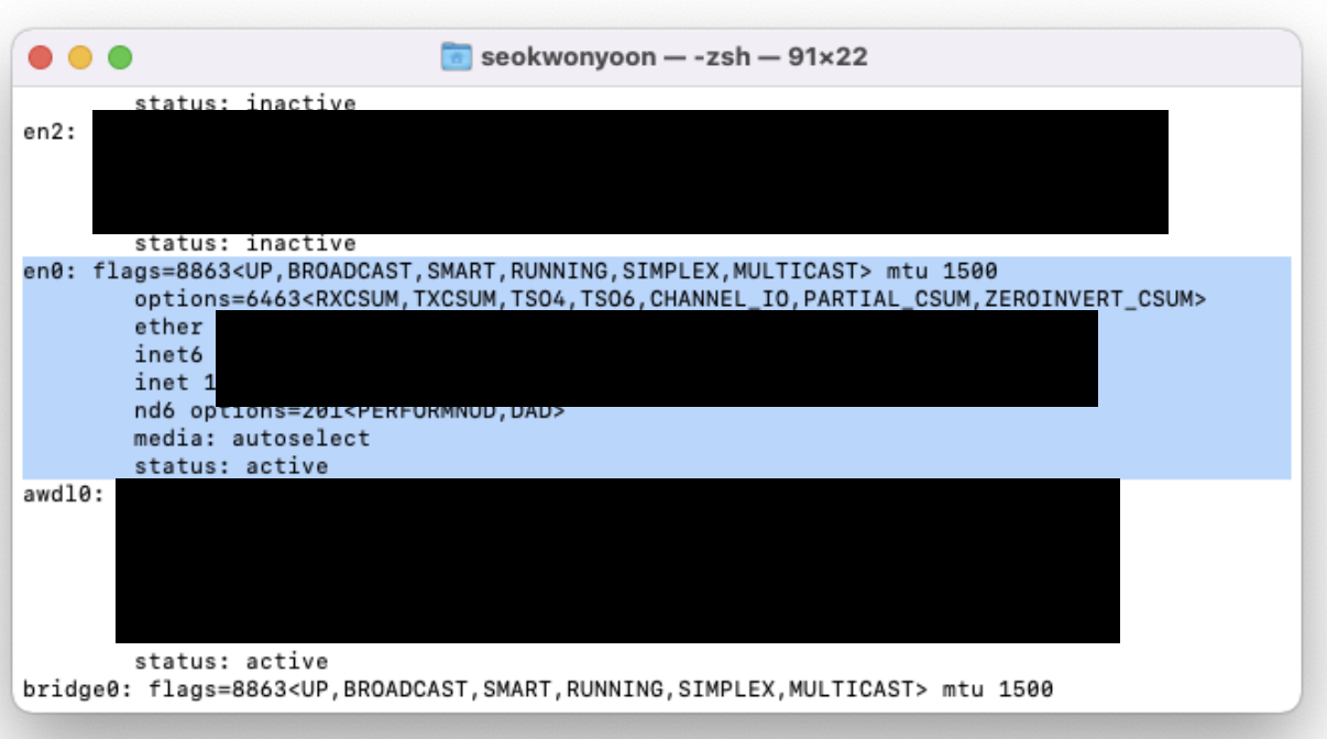 맥 환경이기 때문에 ifconfig 명령어로 내 ip주소와 network interface가 무엇인지 확인해보자.