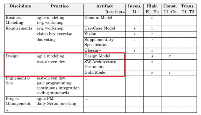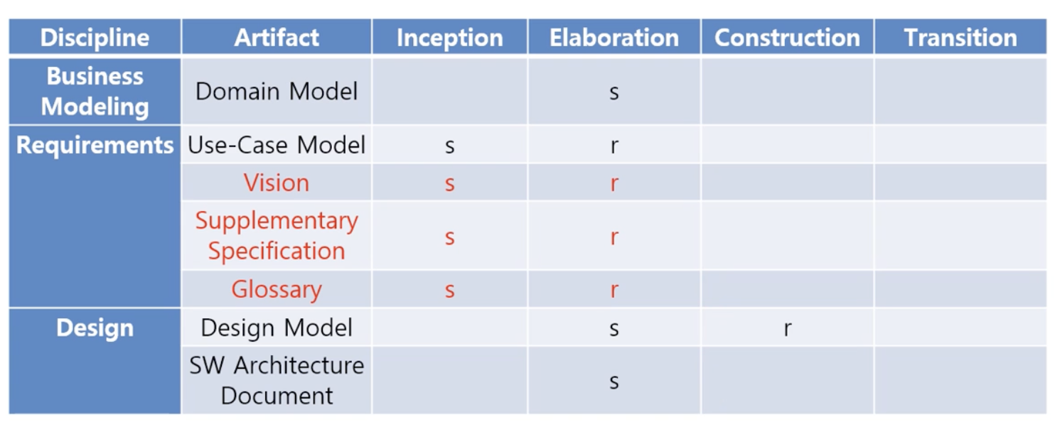 - 이런식으로 프로젝트 초기에 discipline과 수행할 활동, 그에 따른 artifact를 표로 정리할수도 있다.