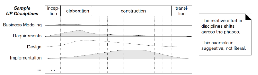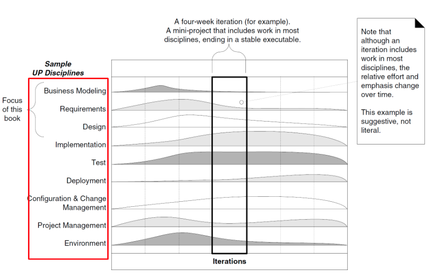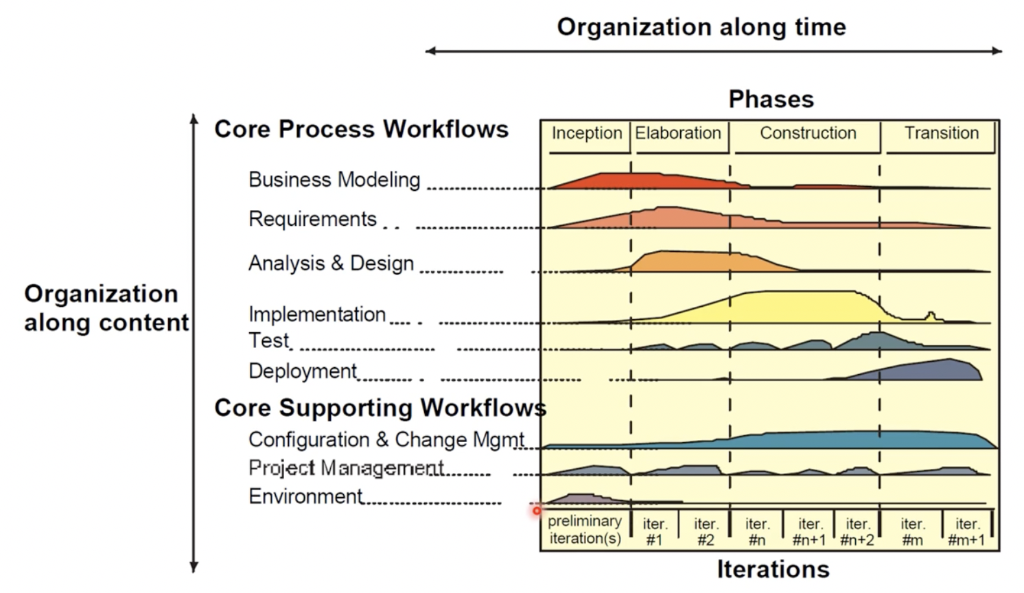 - 시간이 지나면서 새로운 phase로 진입하지만 각 phase안에서 좌측 세로로 나열된 작업들의 iteration들이 이루어진다.