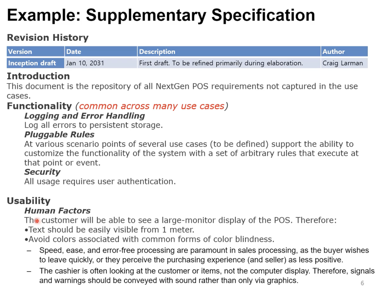 - 위의 예시를 보면 POS 시스템 디자인에 대한 supplementary specification이다. 글자 크기, 화면의 크기 같은 non-functional한 내용이 주로 담겨있다.
