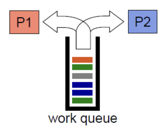 코어,쓰레드들이 각자 task queue로 부터 일을 가져가서 수행한다. work queue가 다 빌때까지 동적으로 load balancing이 수행된다.