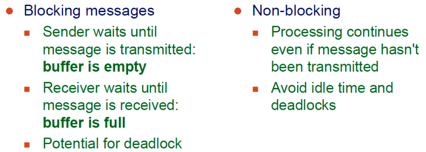 blocking(synchronous) : ex)sender는 메시지의 응답이 올때까지 기다린다. 즉 communication이 끝날때까지 block된다.
