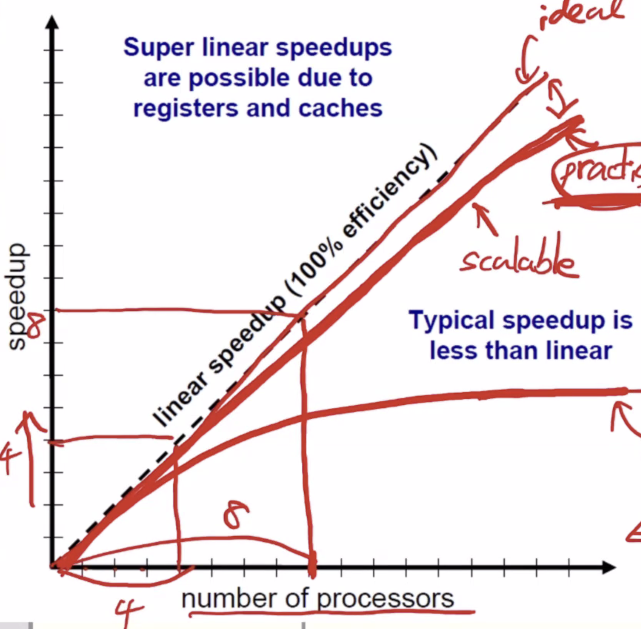 cache utilization, cpu scheduling등이 받쳐주면 ideal한 그래프보다 더 높은 scalability도 가능하다.